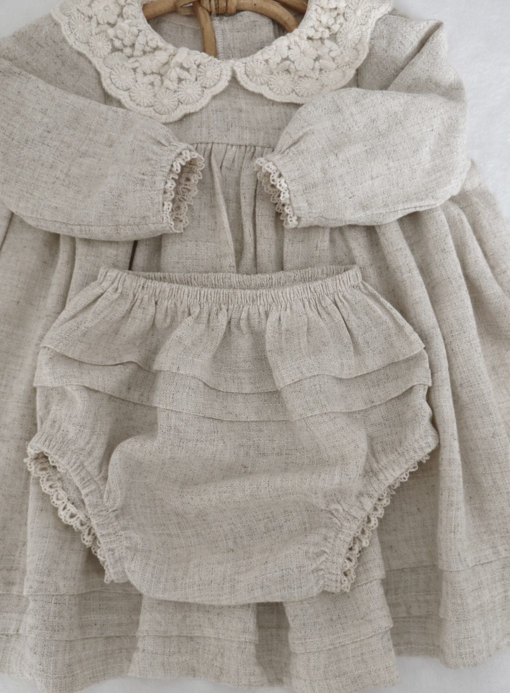 Delikatne bloomersy wykonane z naturalnej mieszanki lnu i wiskozy, miękkiej i przyjemnej dla skóry dziecka.