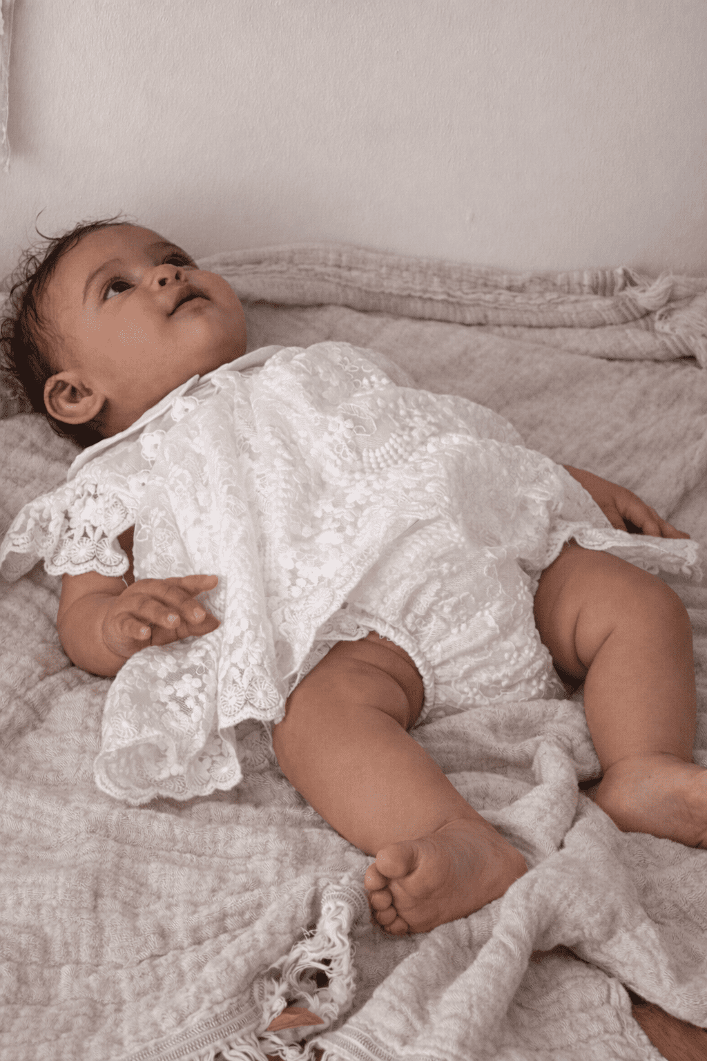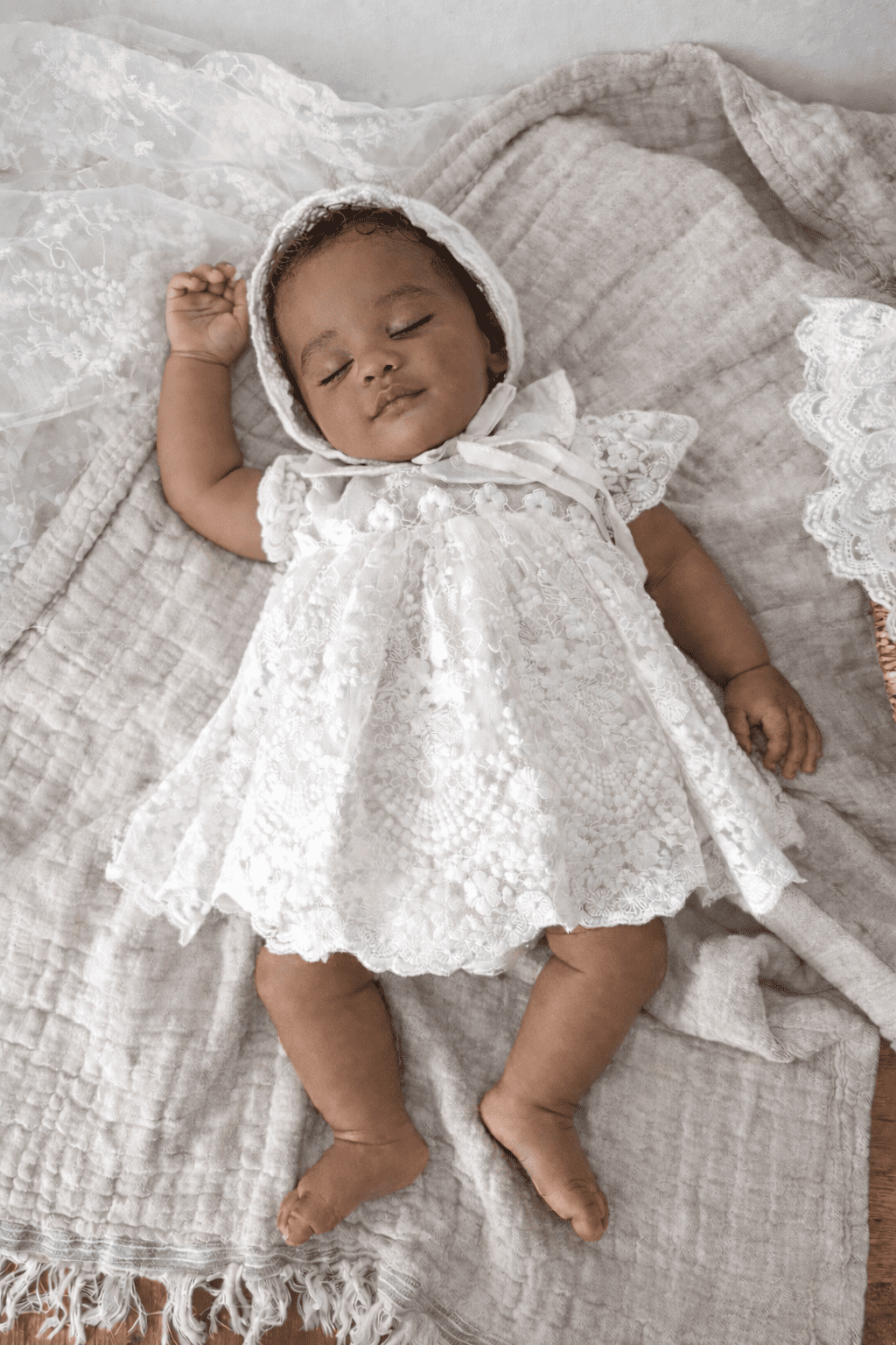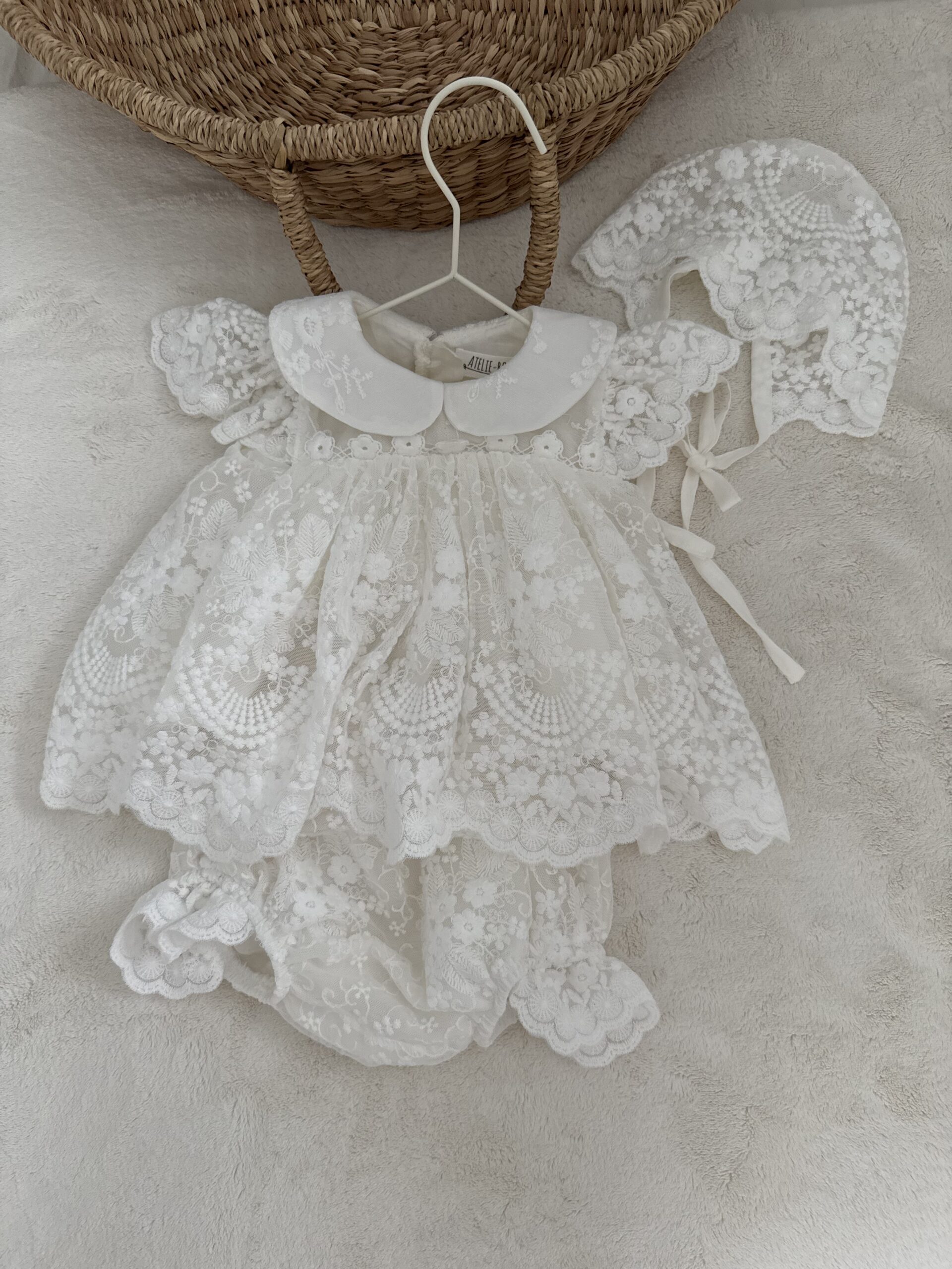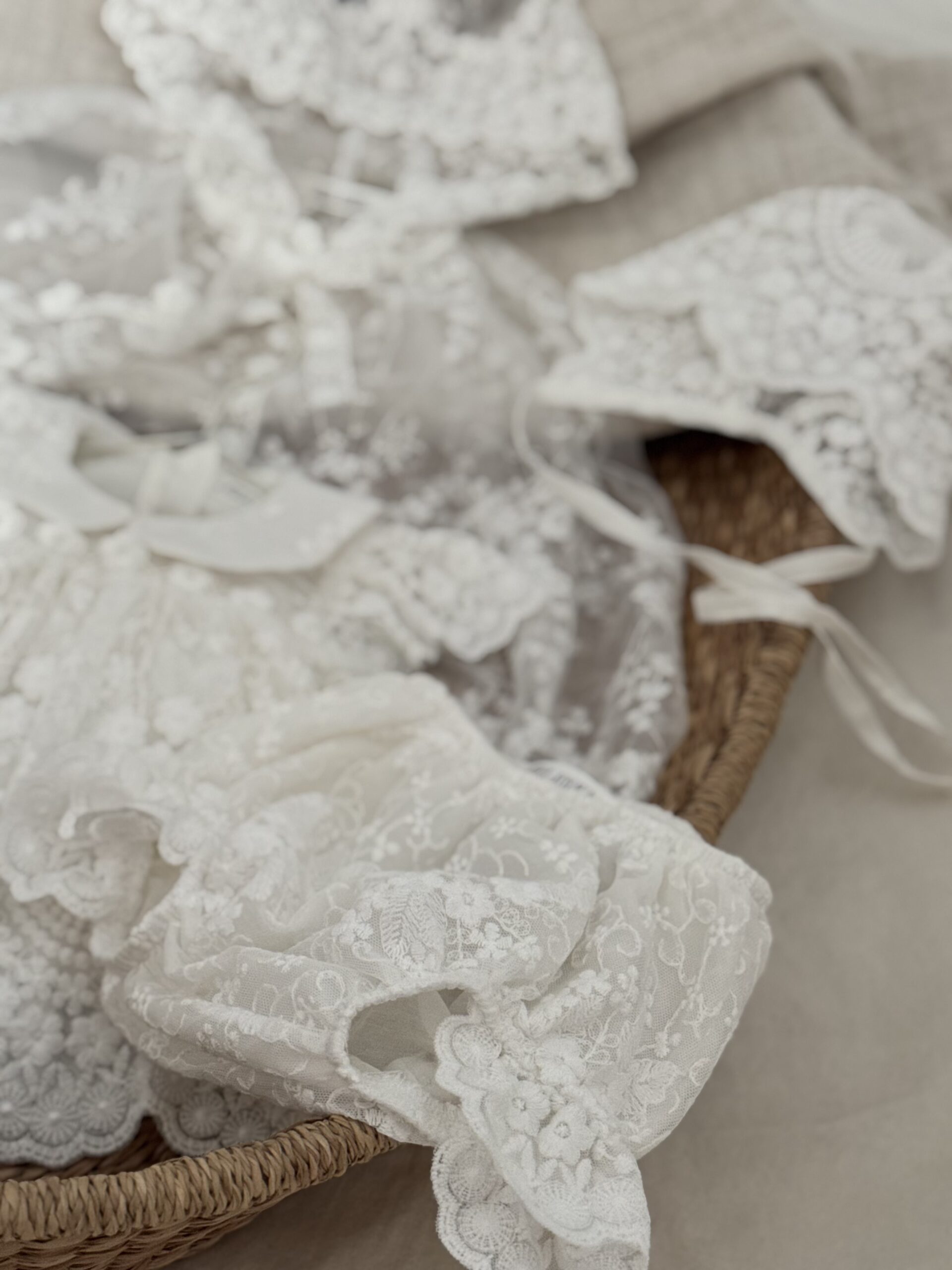 Bloomersy stanowią idealne dopełnienie zestawu z sukienką Elise oraz koronkową bonetką, tworząc elegancki i spójny komplet na wyjątkowe chwile.