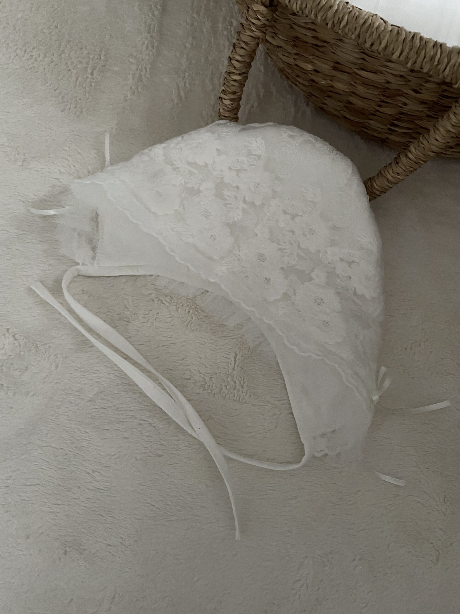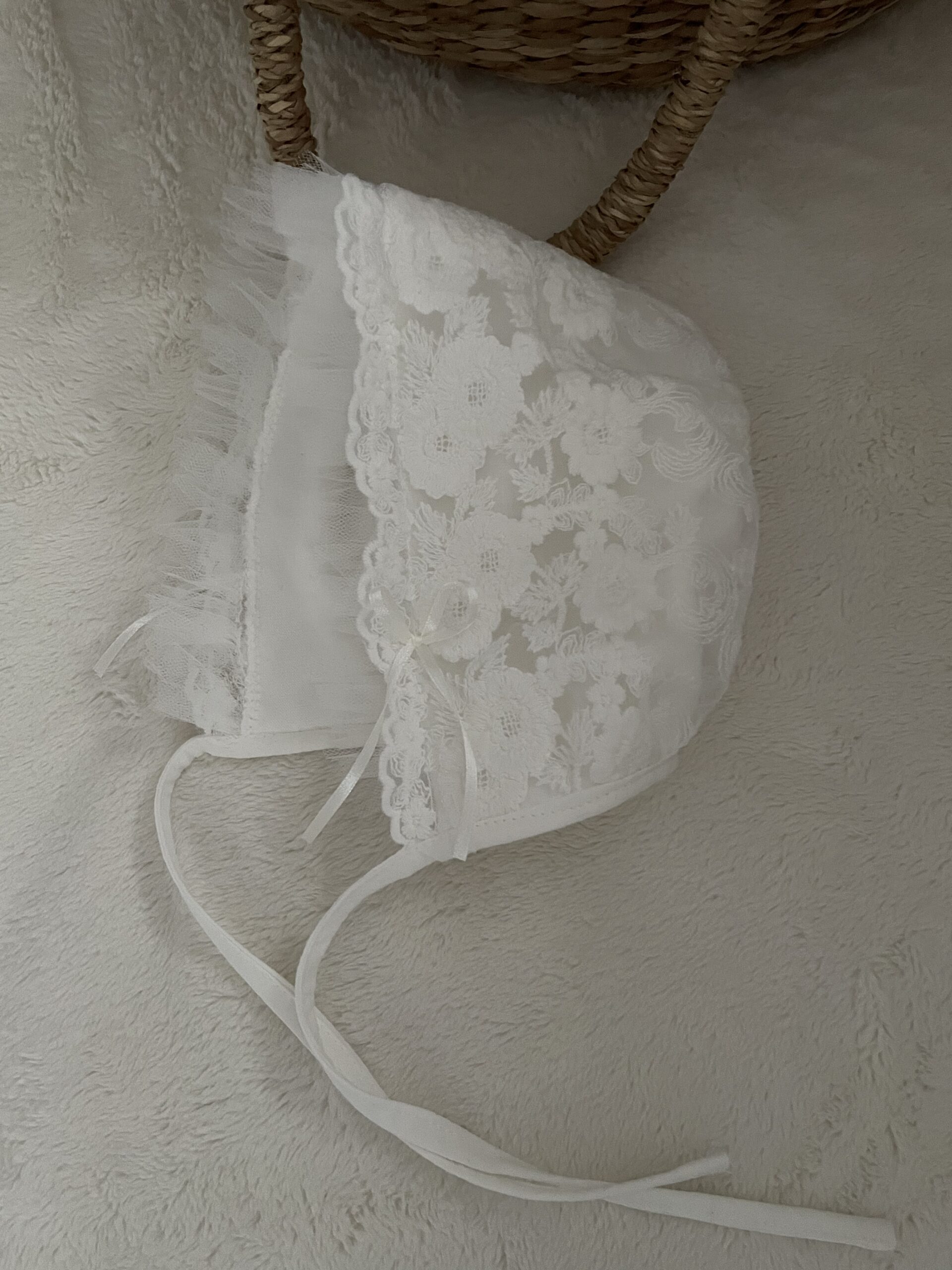 Czapeczka wykonana z haftowanej koronki bawełnianej z tiulowa falbanką i kokardkami.