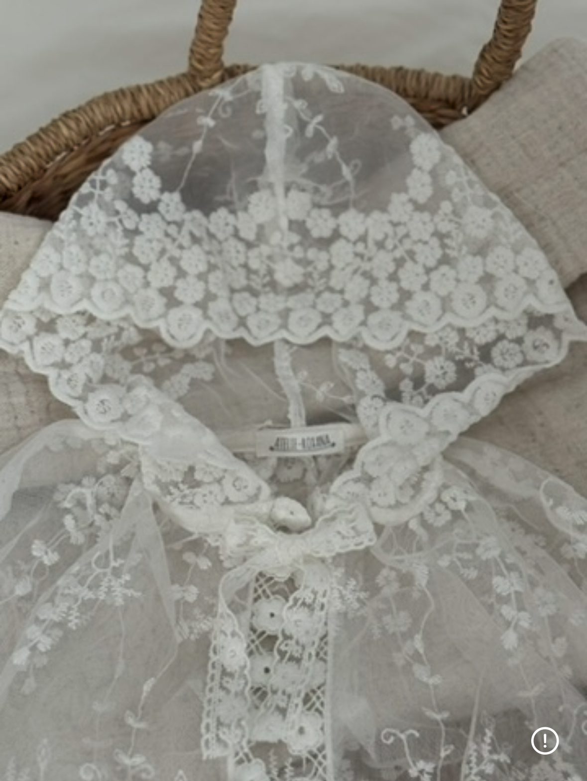 Model posiada subtelny kapturek oraz ozdobne koronkowe troczki do wiązania, które nadają całości wyjątkowego, dziewczęcego charakteru.
