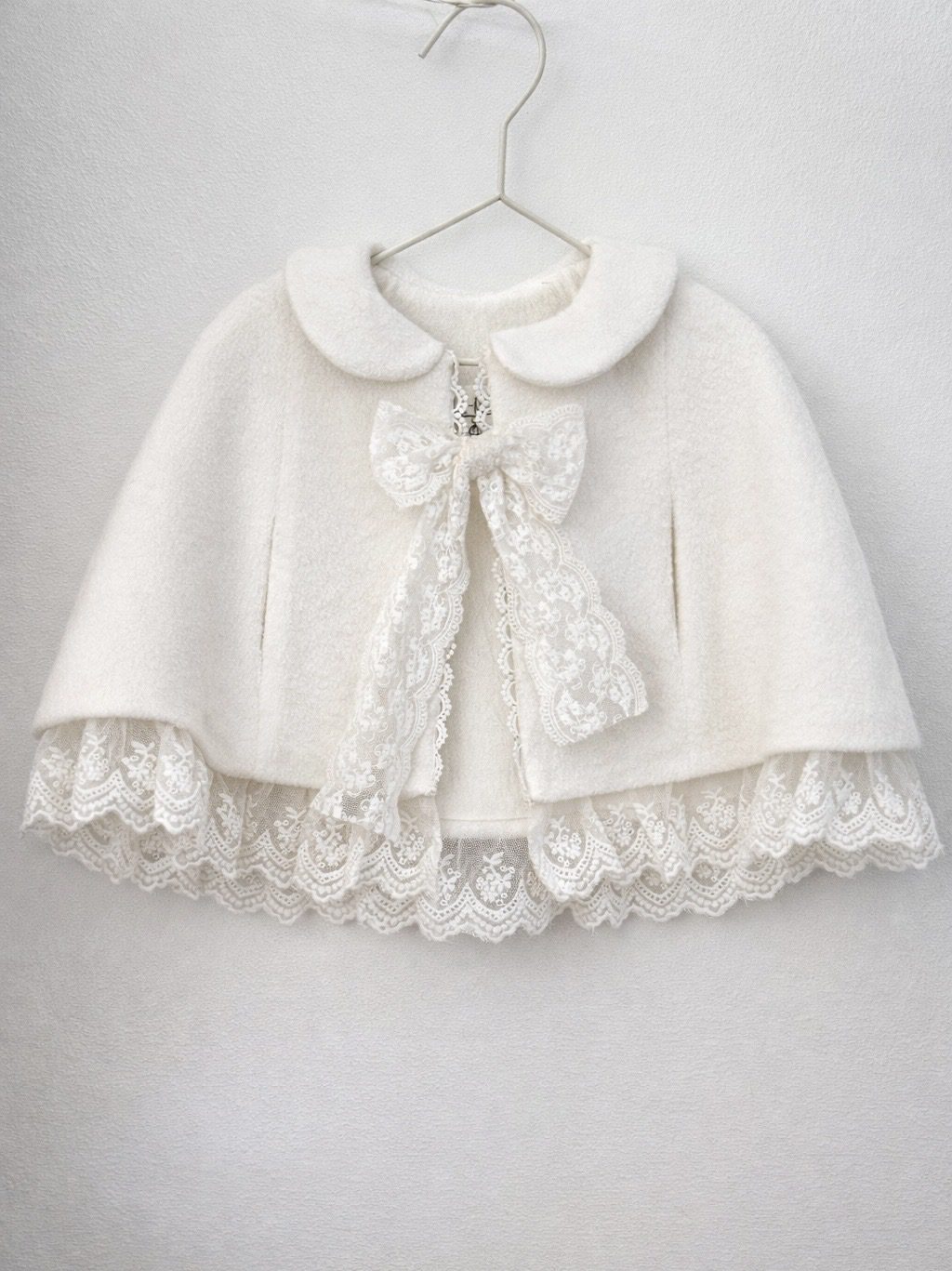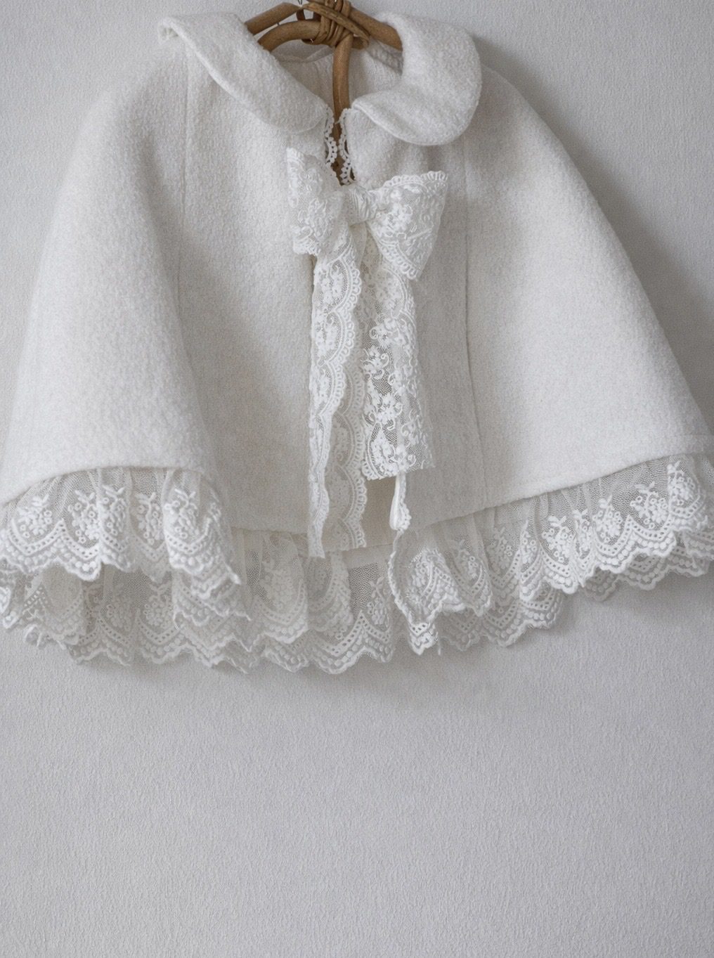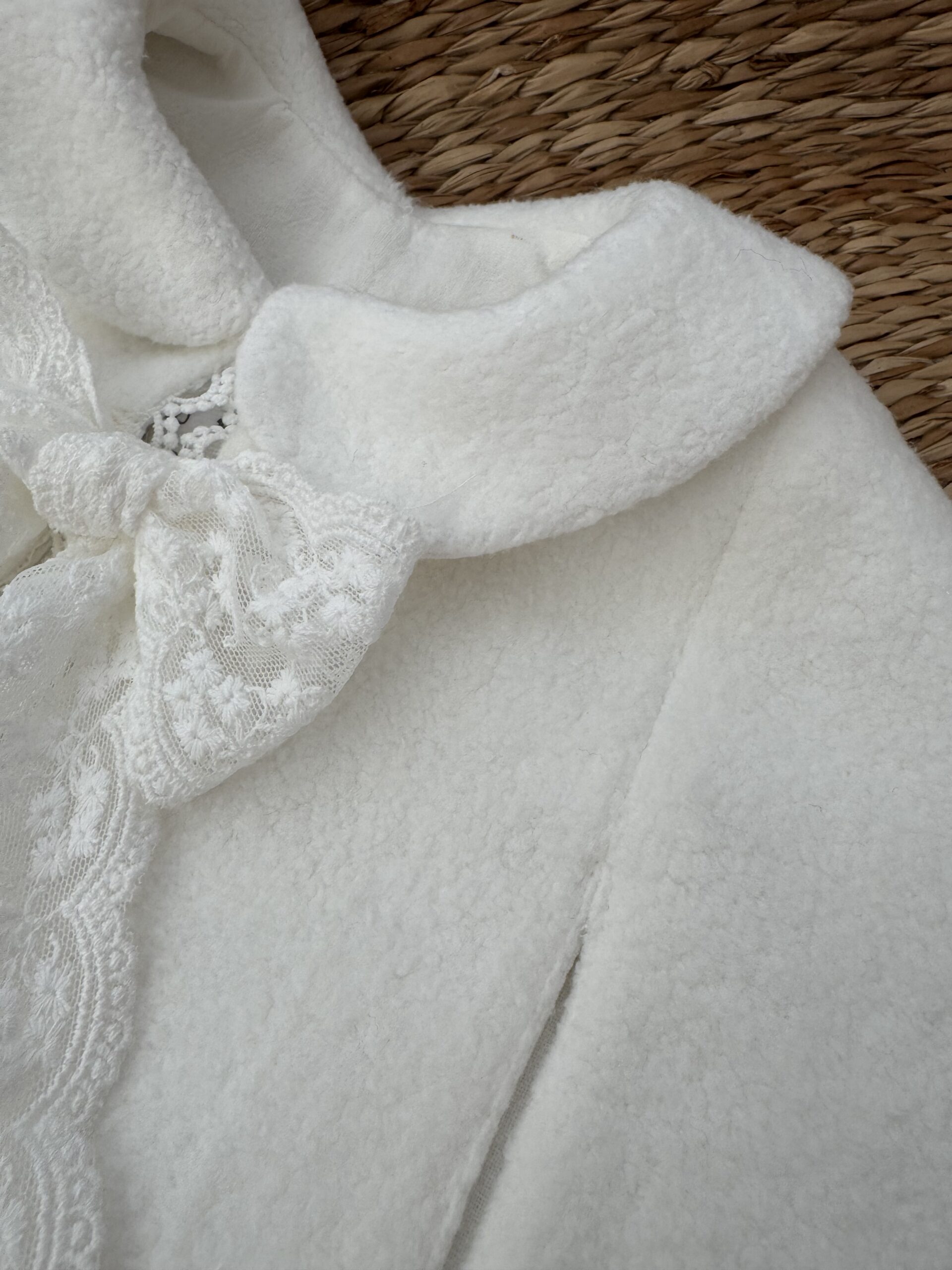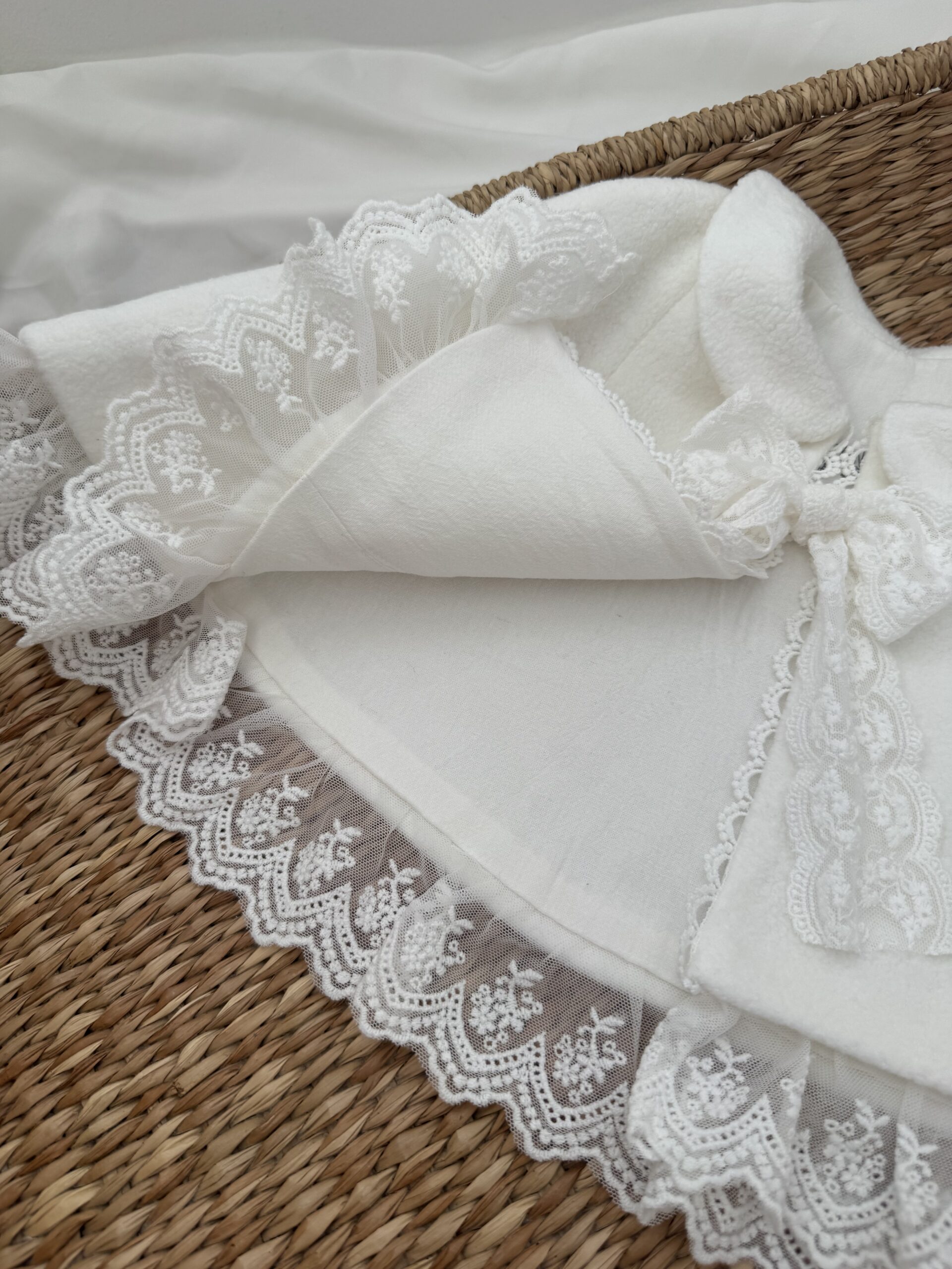 Dolna krawędź wykończona została subtelną koronką, a całość dopełnia delikatne koronkowe wiązanie, które nadaje pelerynce wyjątkowego, dziewczęcego charakteru.