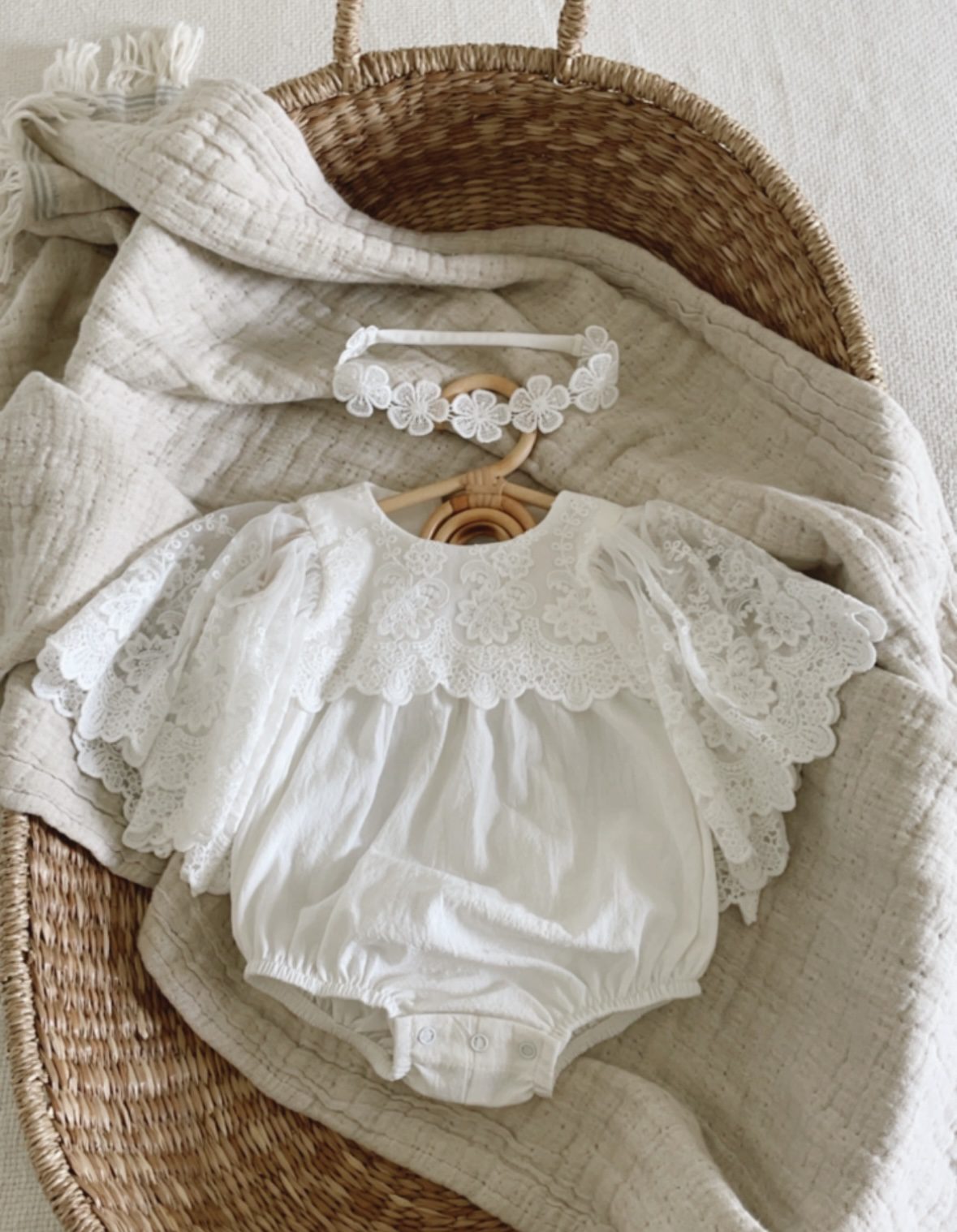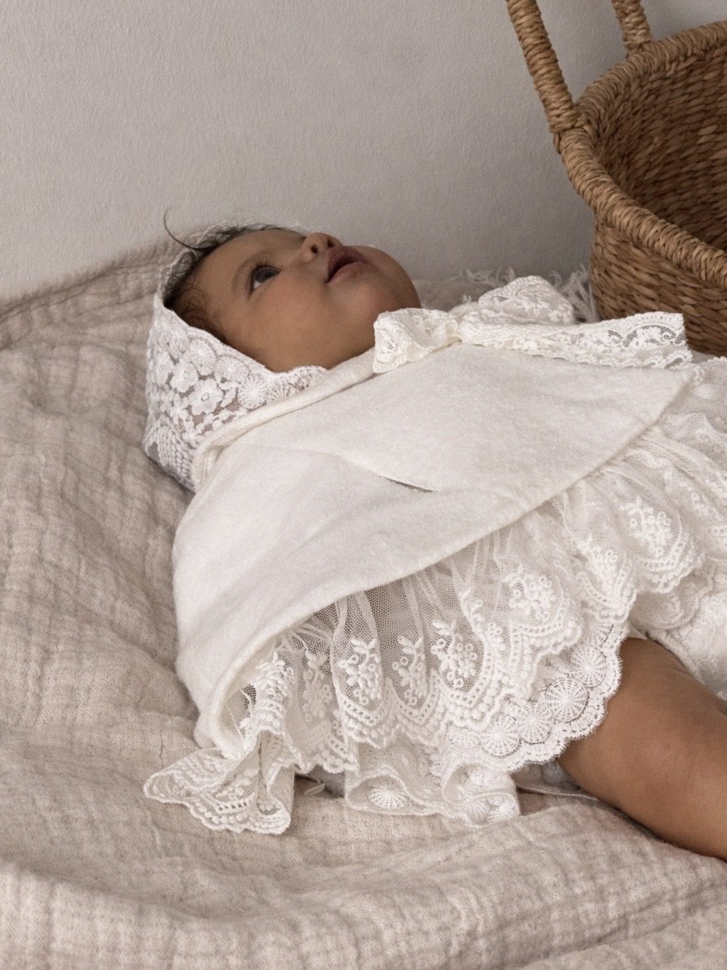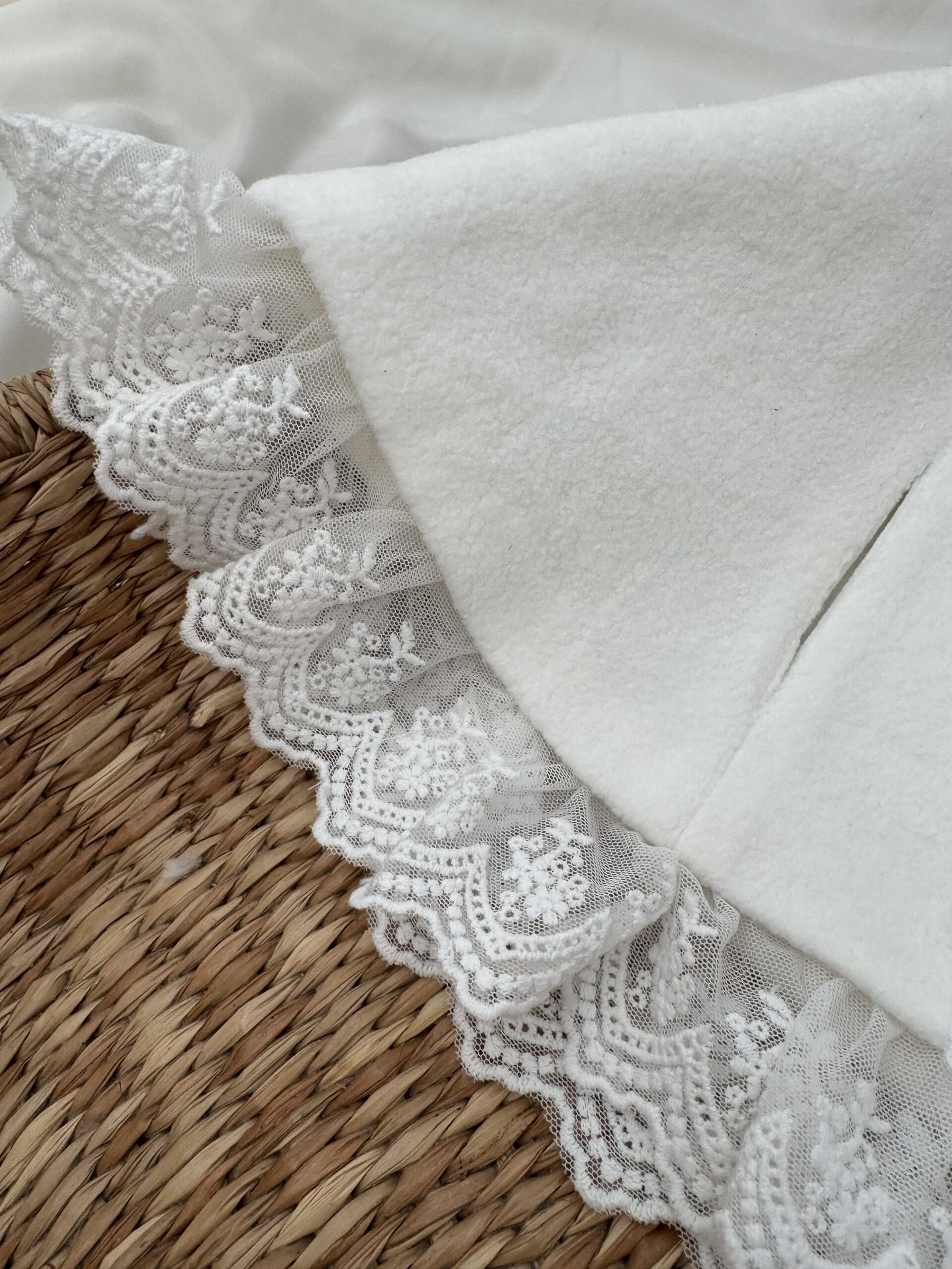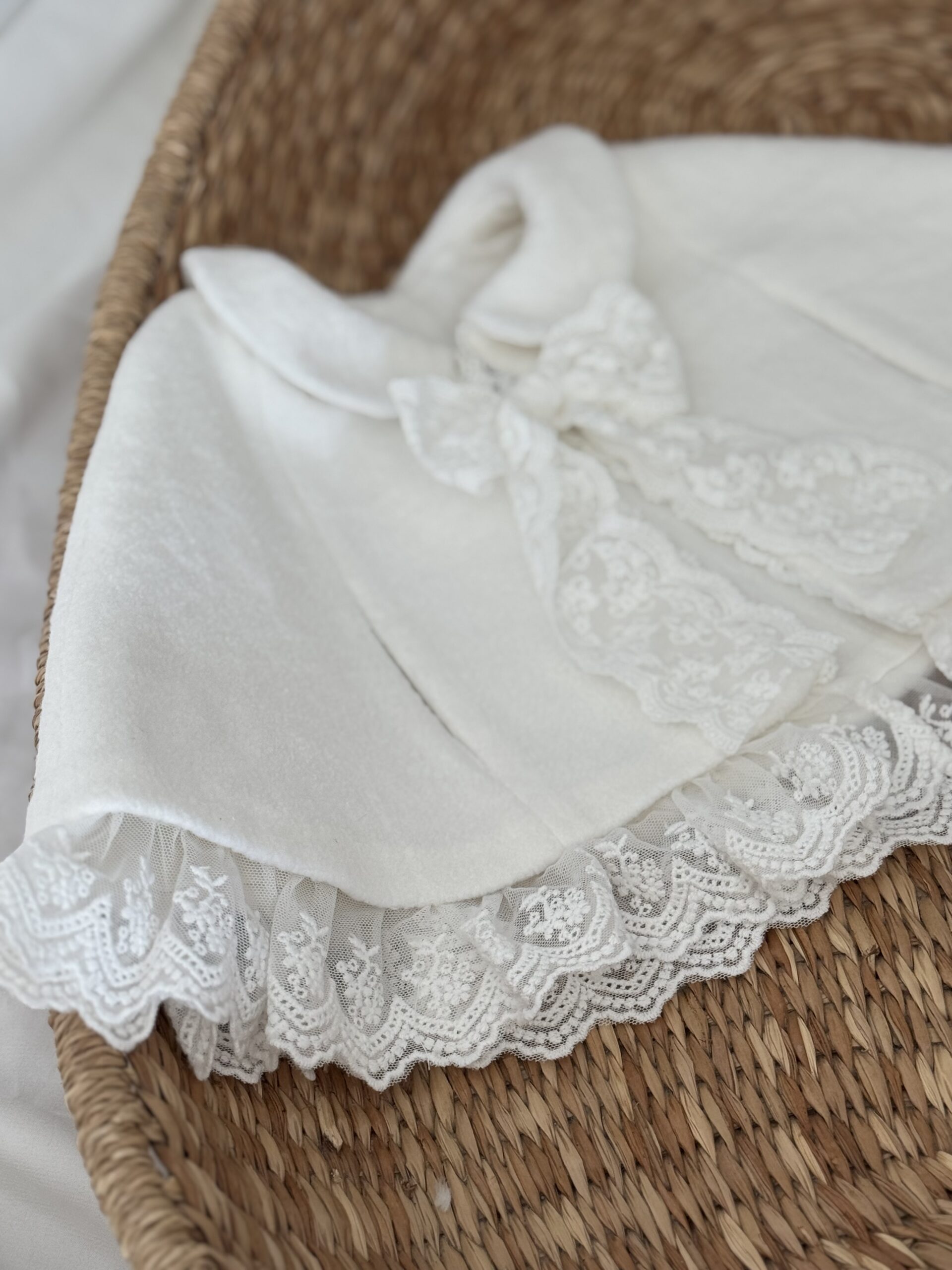 Dolna krawędź wykończona została subtelną koronką, a całość dopełnia delikatne koronkowe wiązanie, które nadaje pelerynce wyjątkowego, dziewczęcego charakteru.