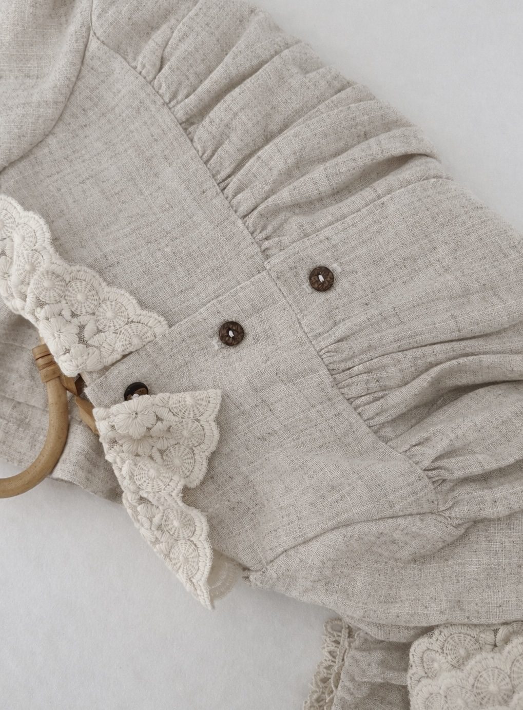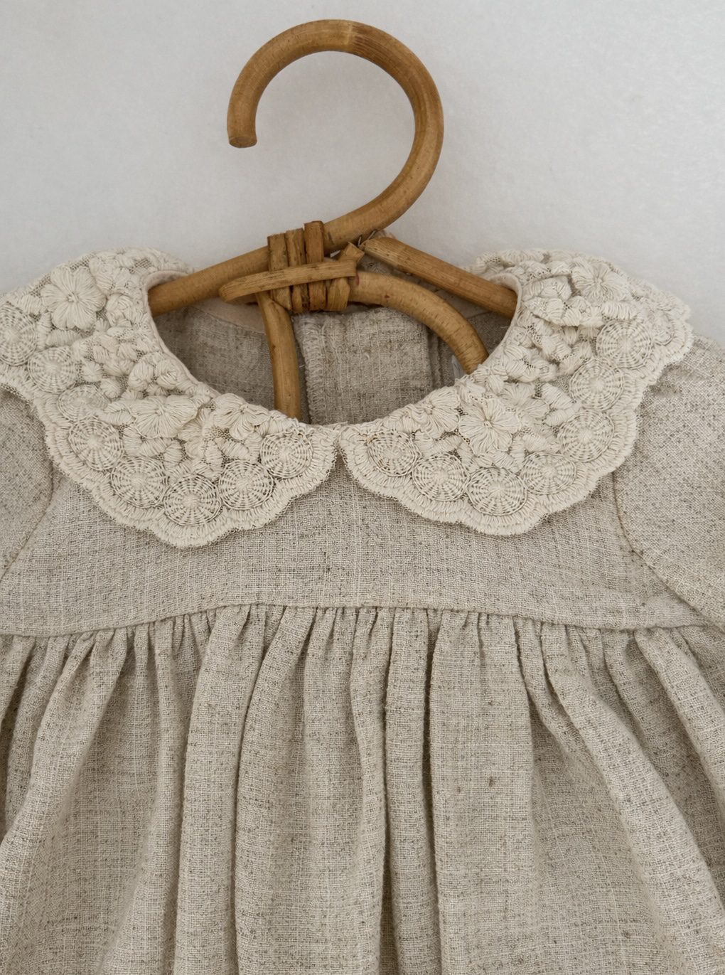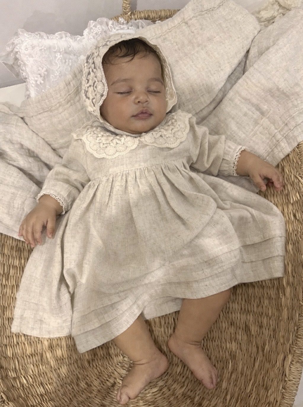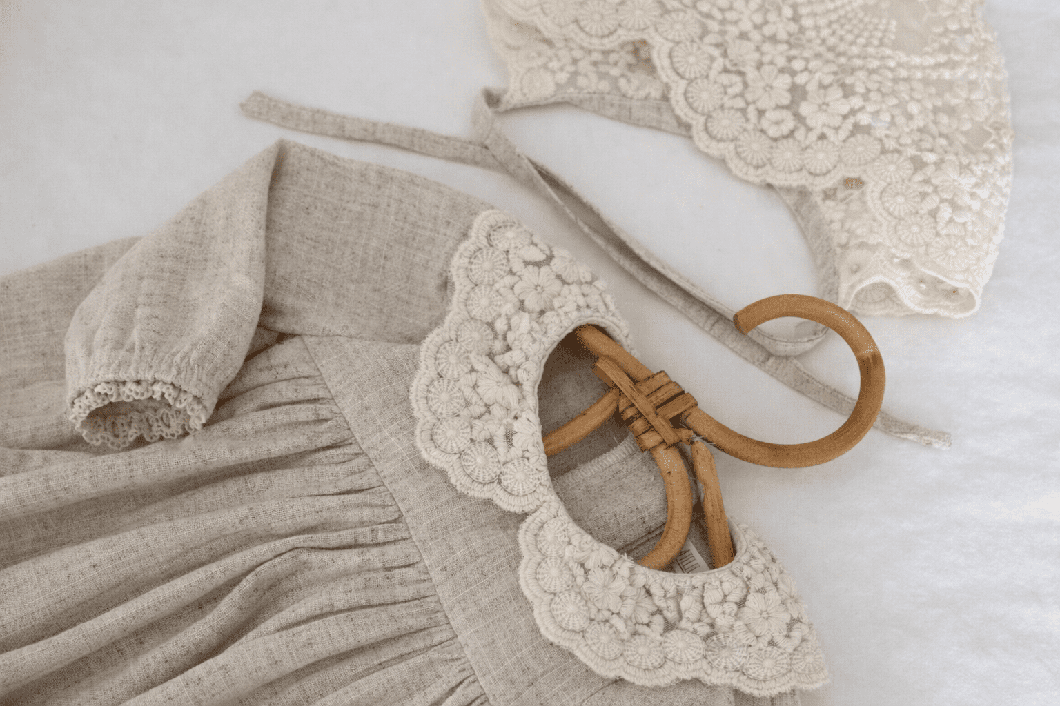 Do sukienki można dobrać dodatki z kolekcji — bloomersy, bonetkę lub opaskę — tworząc w pełni dopracowaną, harmonijną stylizację.
