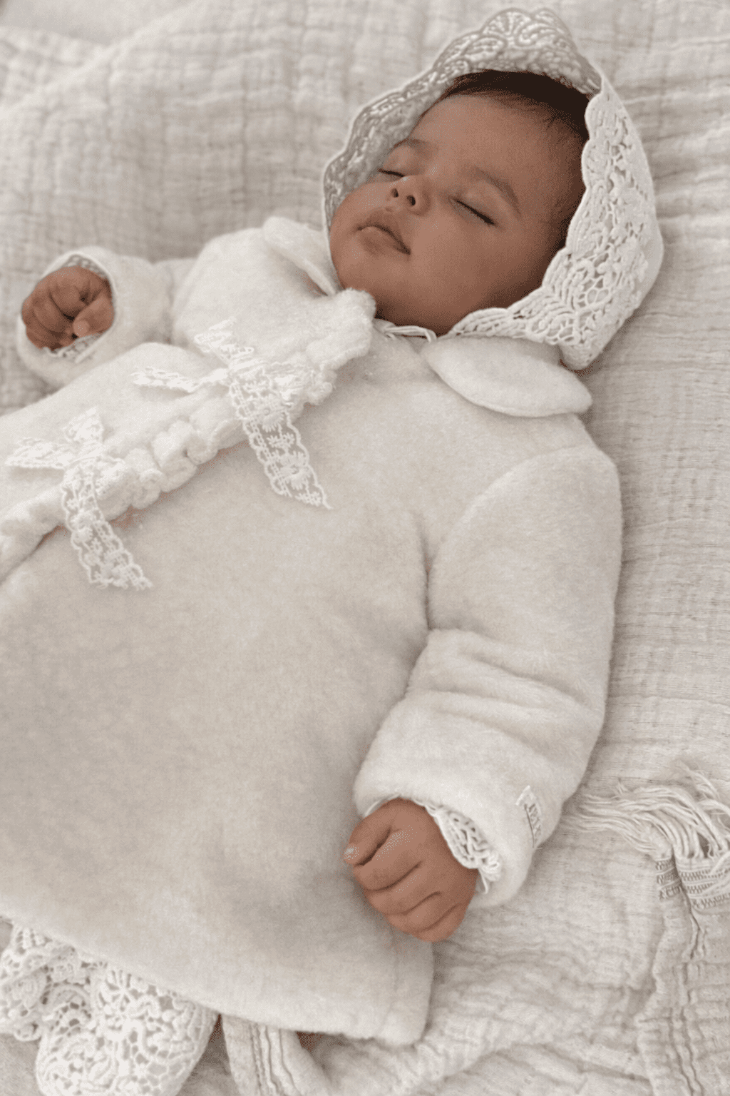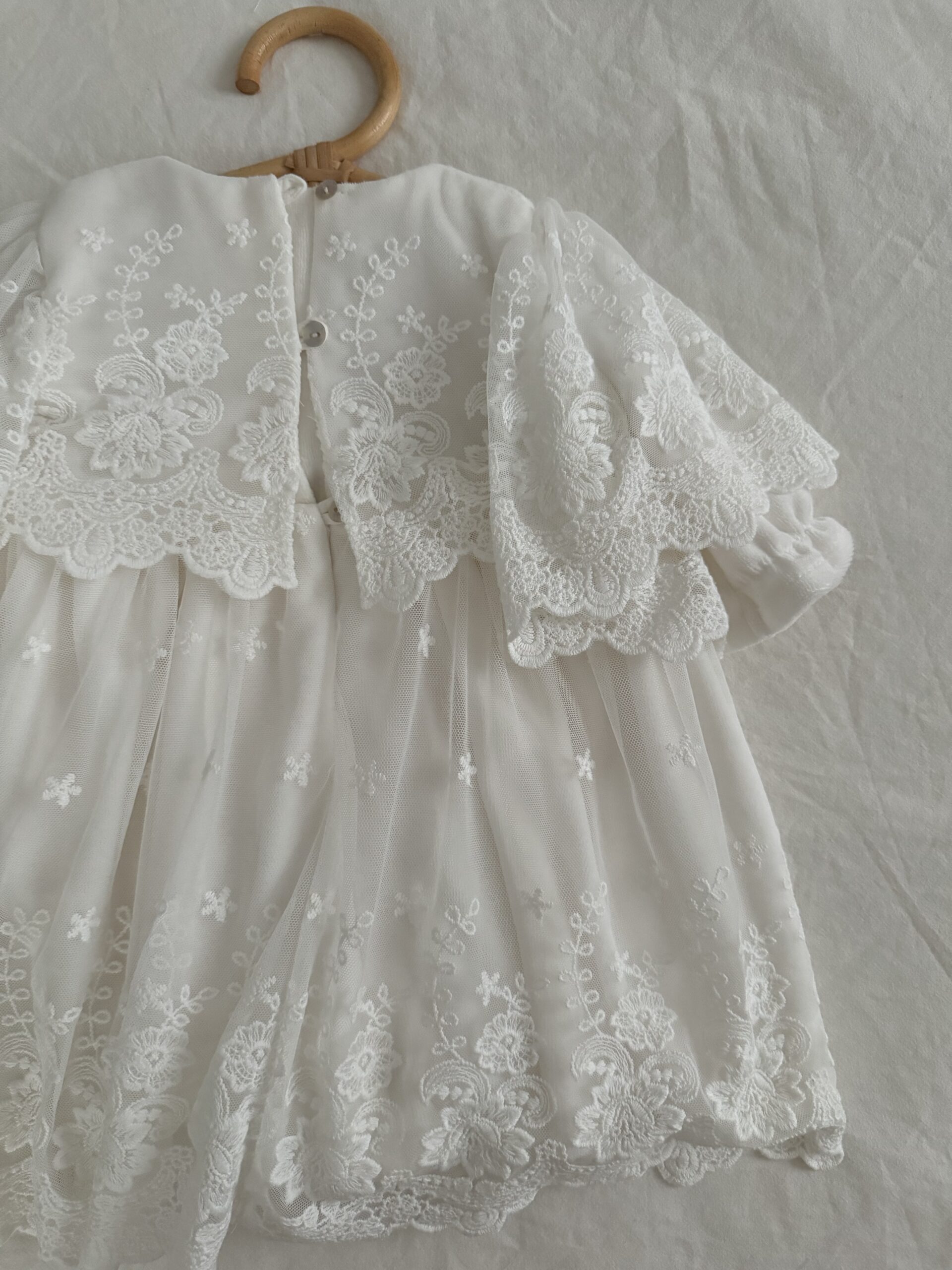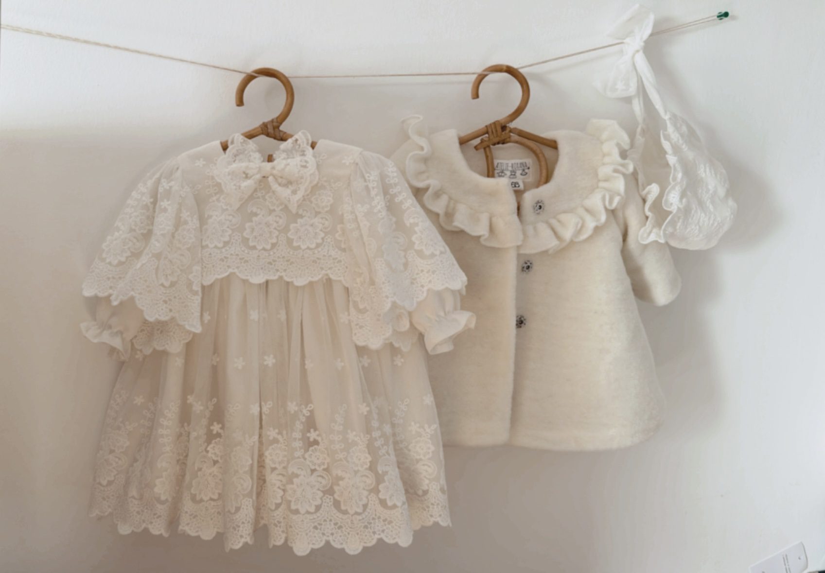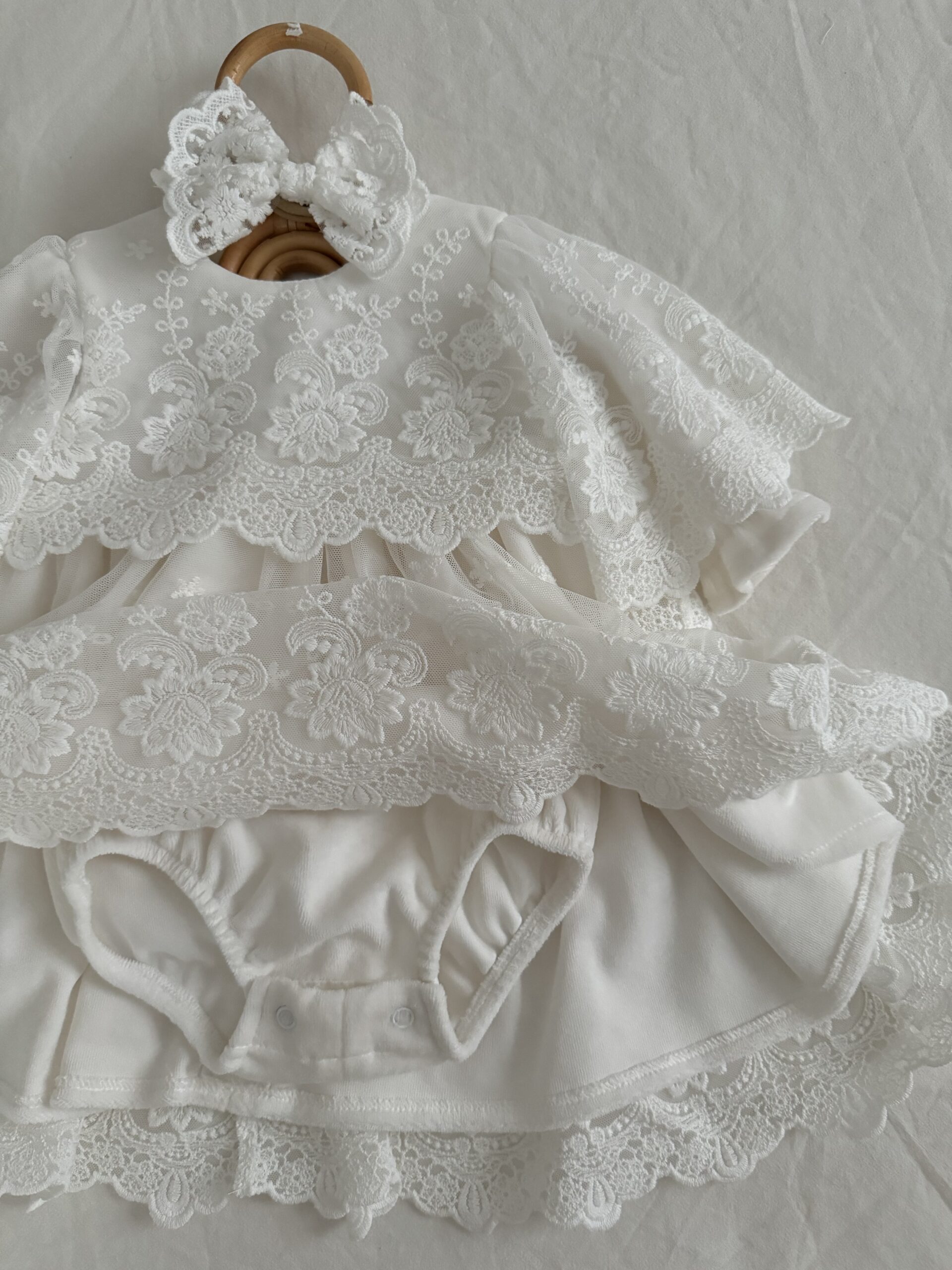 Sukienka Chloe z weluru bawełnianego – elegancka i ciepła propozycja na chrzest, przyjęcia i wesela. Haftowana siateczka, miękki welur i subtelne detale tworzą wyjątkową kreację dla najmłodszych. Dostępna w śmietankowej bieli i beżu.