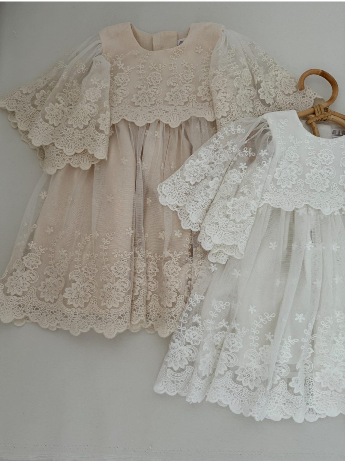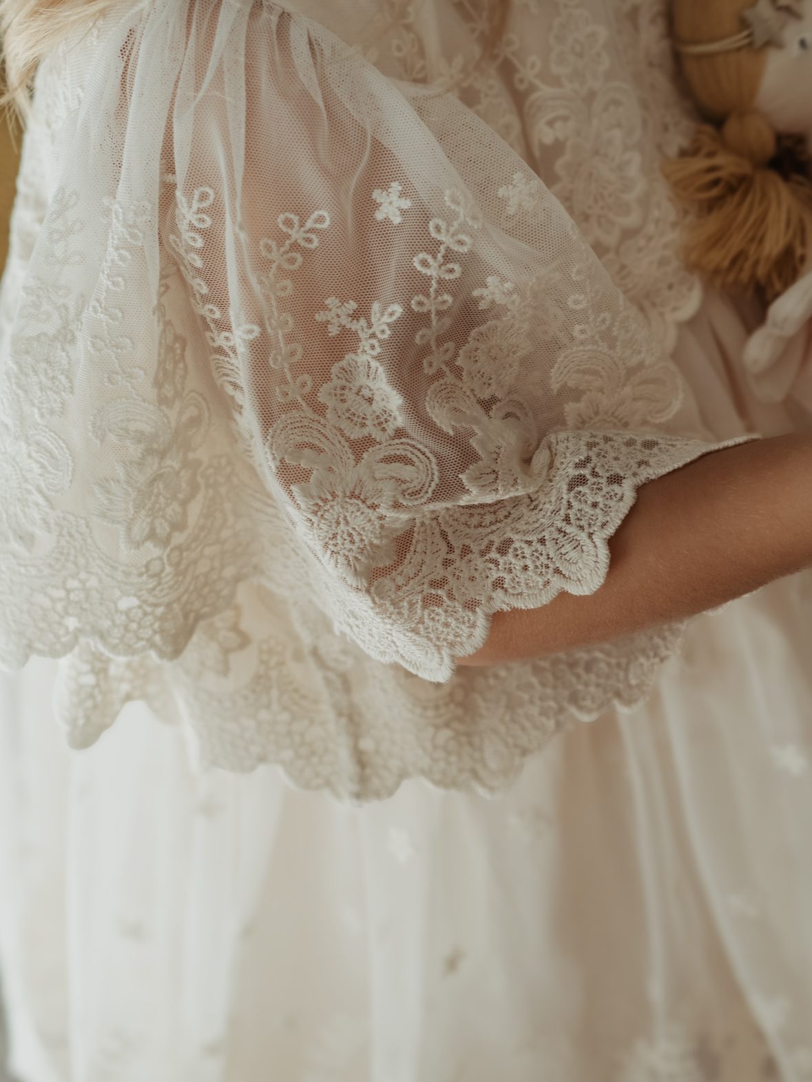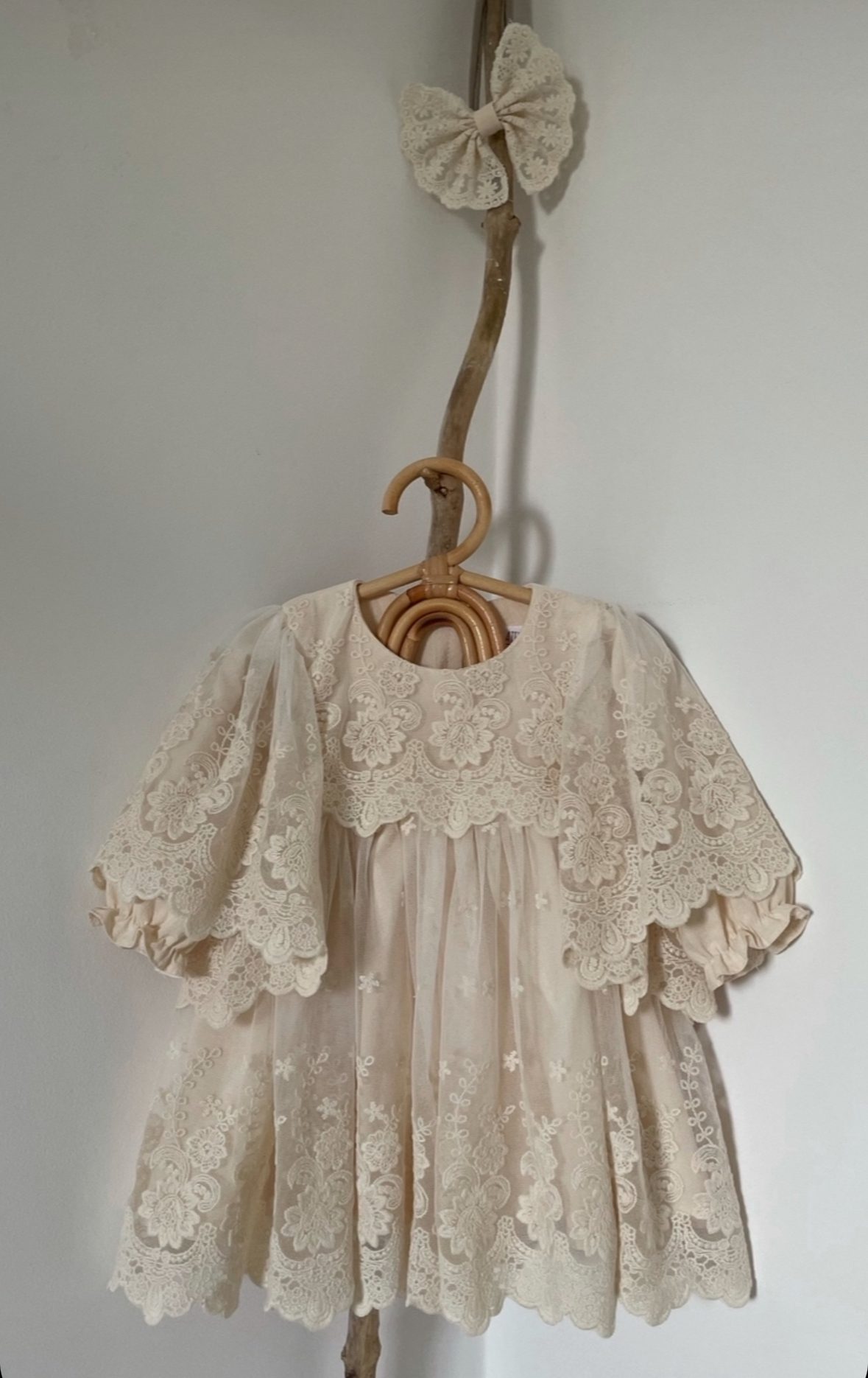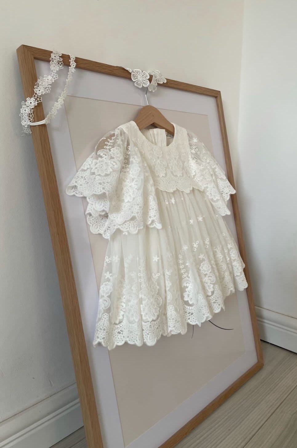 Sukienka Chloe – elegancka sukienka do chrztu, na roczek, wesela i inne uroczystości. Wykonana z delikatnej haftowanej siateczki z podszewką z 100% bawełny. Motylkowe rękawki, subtelne guziczki z masy perłowej i wyjątkowy krój nadają jej lekkości i uroku. Dostępna w wersji z krótkim i długim rękawem oraz w kolorach: śmietankowa biel, waniliowy beż i śmietankowo-kremowa.