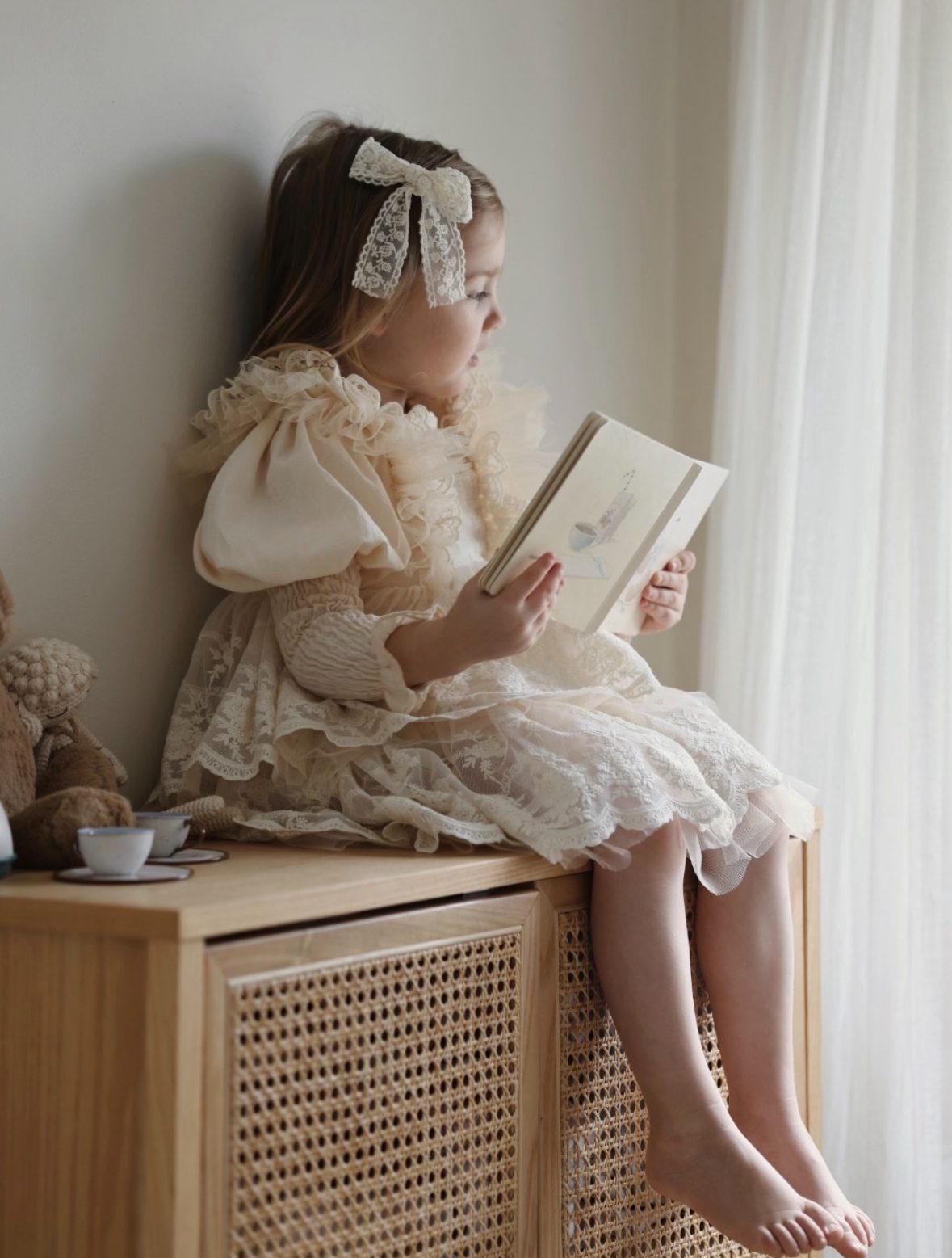 Motylkowe rękawki dodają sukience elegancji, a subtelne guziczki z masy perłowej z tyłu stanowią piękne wykończenie. Głębokie rozcięcie zostało zaprojektowane tak, aby ułatwiać zakładanie sukienki najmłodszym dziewczynkom. W mniejszych rozmiarach istnieje możliwość wszycia body dla jeszcze większej wygody.