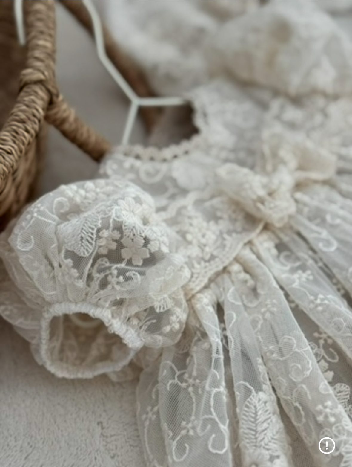 Nieco dłuższy, rozkloszowany fason uzupełniają mocno bufiaste rękawki, nadające sylwetce wyjątkowego charakteru. Subtelna koronkowa kokardka stanowi słodki i romantyczny detal.