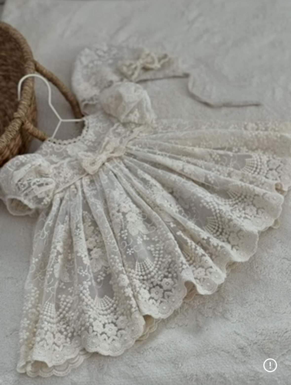 Do sukienki można dobrać koronkową bonetkę oraz bloomersy, tworząc elegancki zestaw.