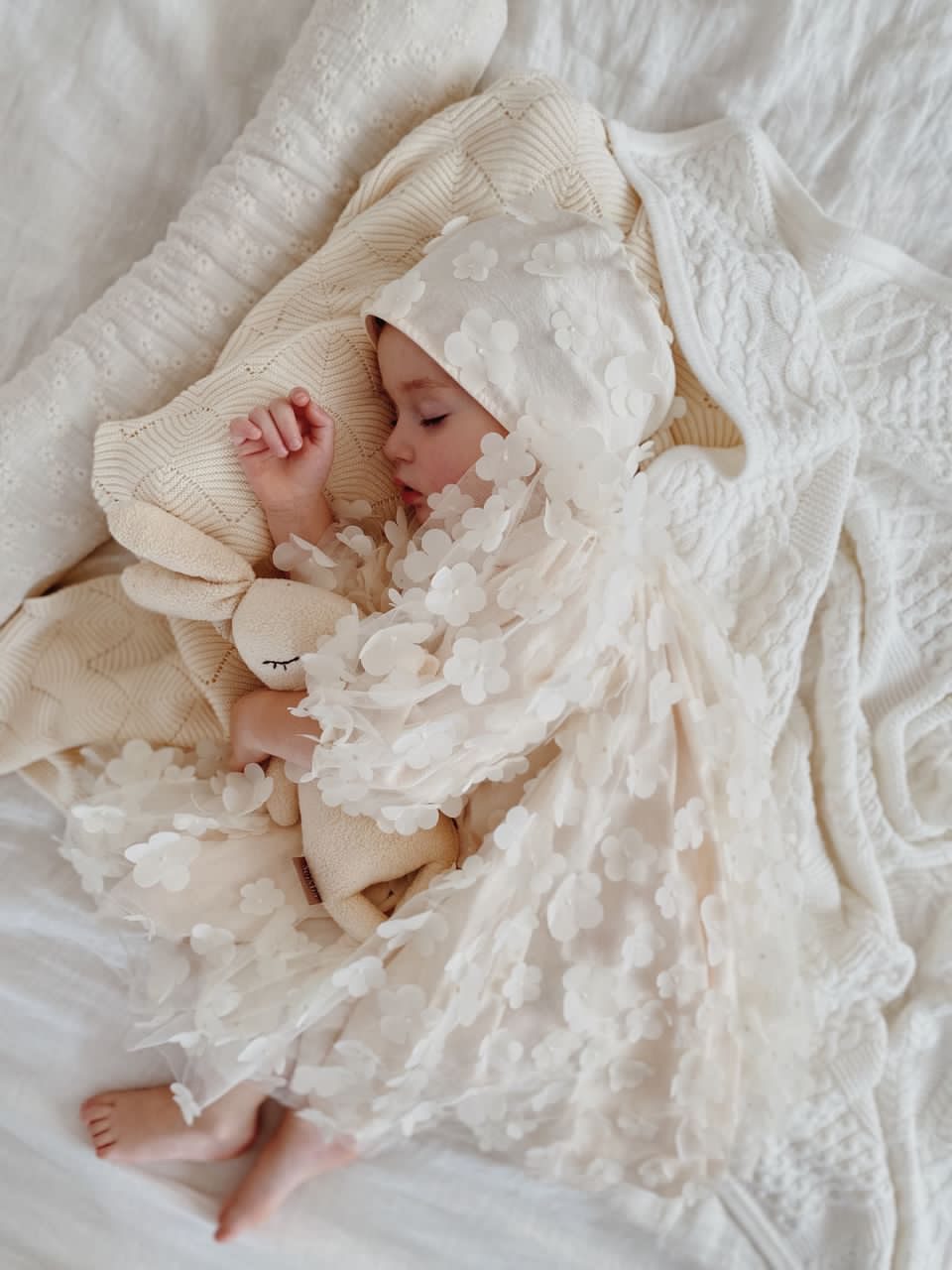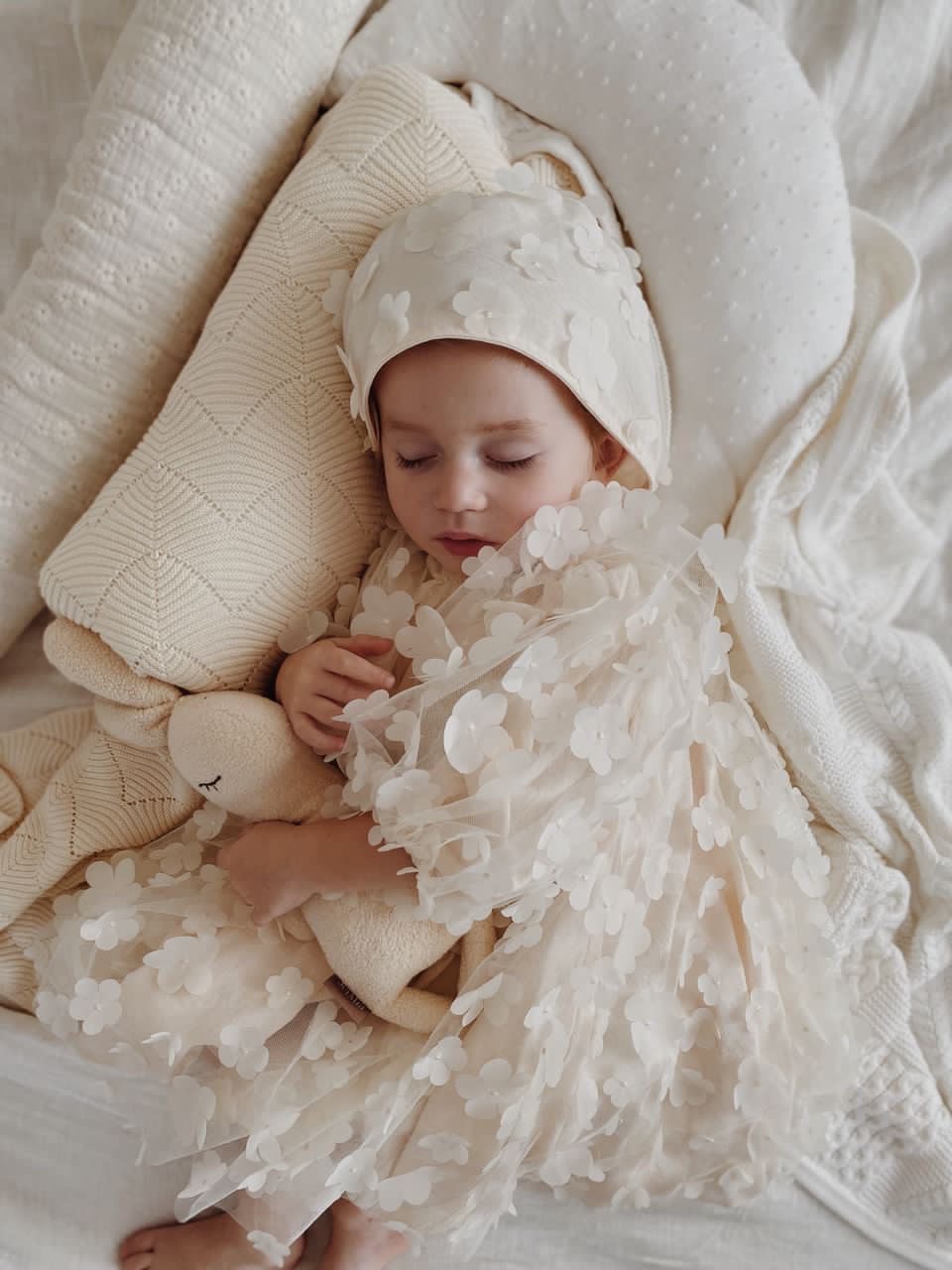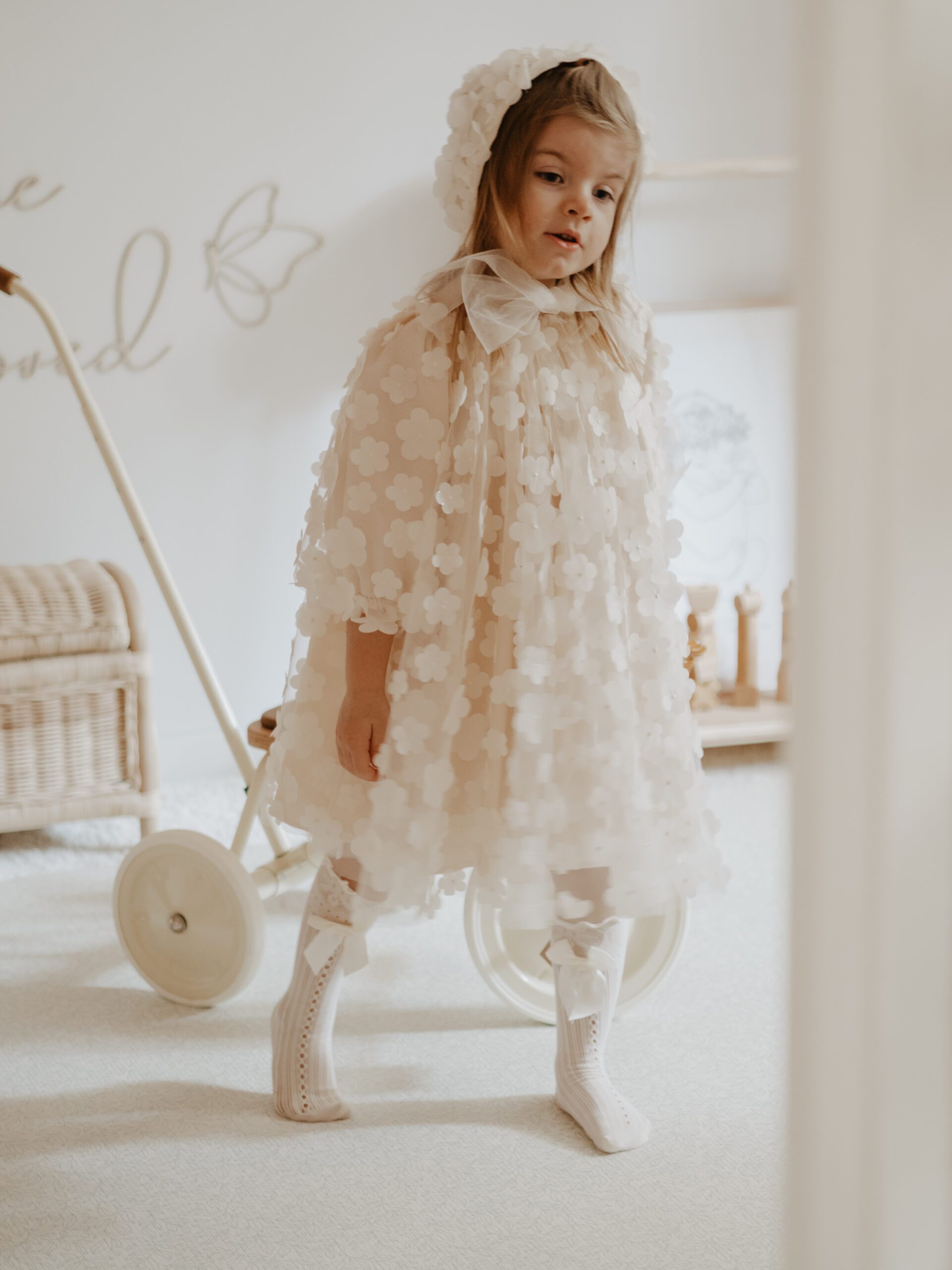 Elegancka i subtelna sukienka dla niemowląt i małych dziewczynek, idealna na chrzest, roczek, wesela i inne uroczystości. Wykonana z efektownego tiulu w kwiatki 3D, który nadaje jej romantycznego charakteru. Skrojona z pełnego koła, co zapewnia piękne układanie się materiału i spektakularny efekt w ruchu. Długie rękawki i bawełniana podszewka gwarantują komfort i wygodę noszenia. Dostępna w kolorach: śmietankowa biel i waniliowy beż. Stylizację można uzupełnić bloomersami, opaską, spineczkami, bonetką lub wiankiem.