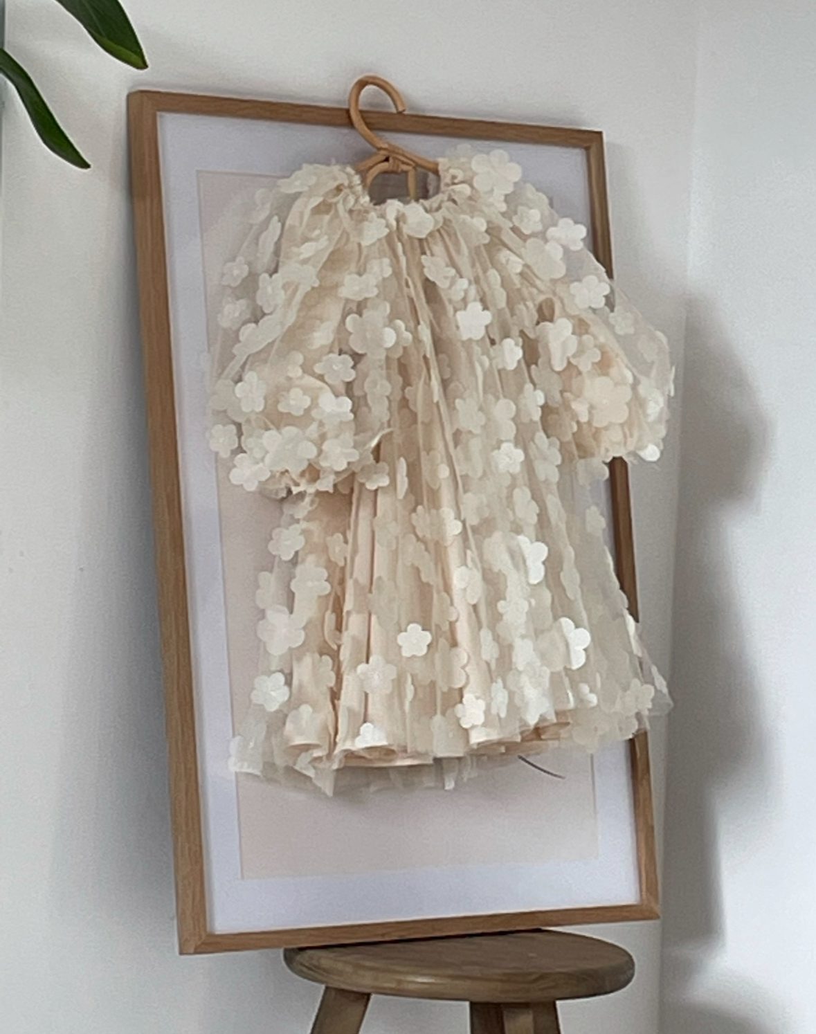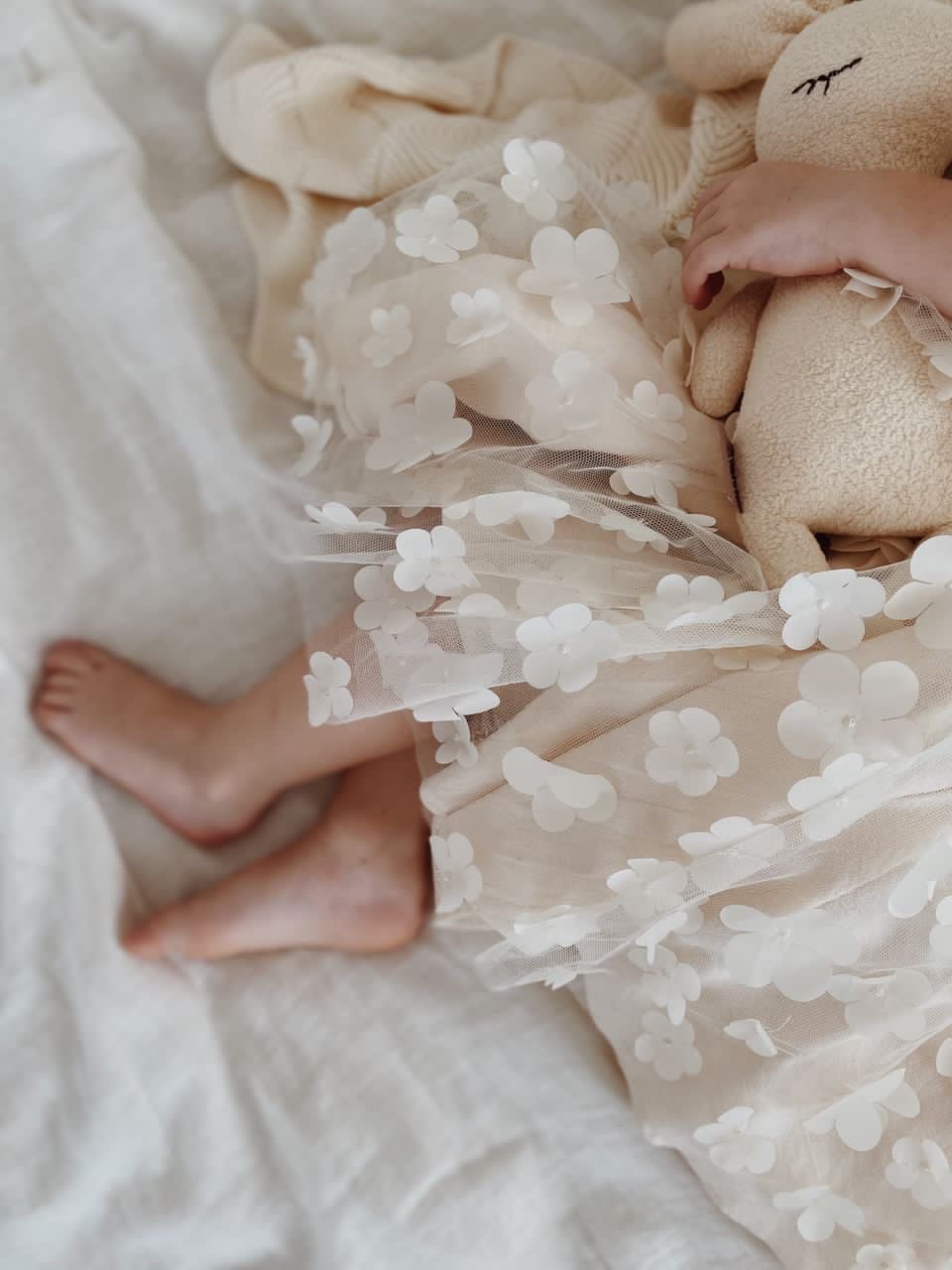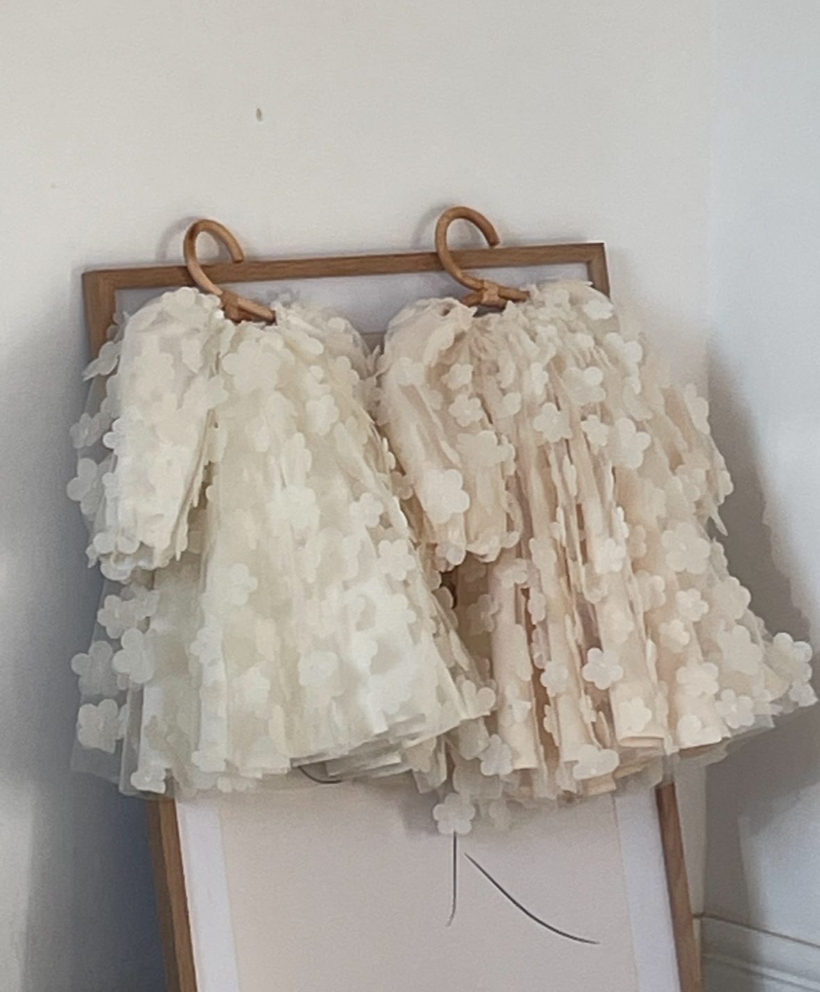 Elegancka i subtelna sukienka dla niemowląt i małych dziewczynek, idealna na chrzest, roczek, wesela i inne uroczystości. Wykonana z efektownego tiulu w kwiatki 3D, który nadaje jej romantycznego charakteru. Skrojona z pełnego koła, co zapewnia piękne układanie się materiału i spektakularny efekt w ruchu. Długie rękawki i bawełniana podszewka gwarantują komfort i wygodę noszenia. Dostępna w kolorach: śmietankowa biel i waniliowy beż. Stylizację można uzupełnić bloomersami, opaską, spineczkami, bonetką lub wiankiem.