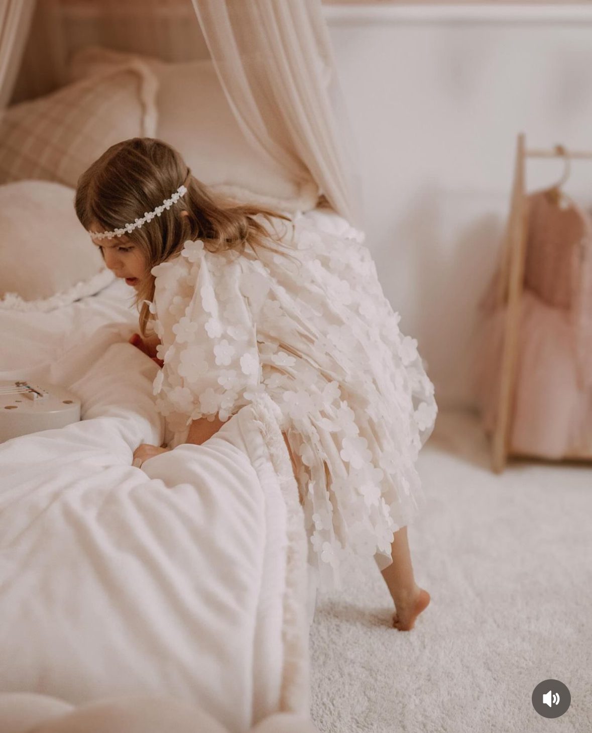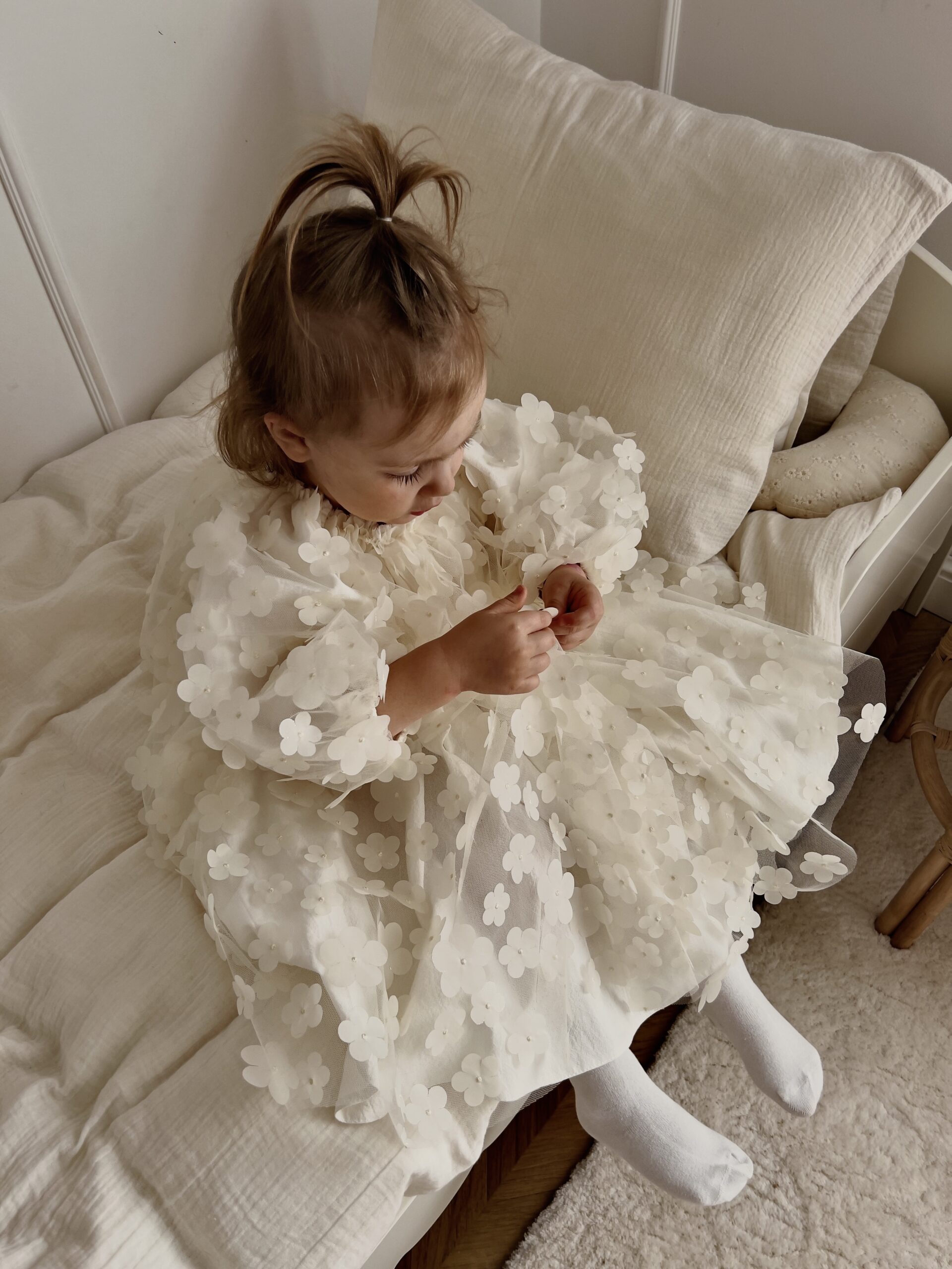 Sukienka Marguerite z długim rękawem to wyjątkowa, pełna wdzięku kreacja dla niemowląt i małych dziewczynek, idealna na wyjątkowe uroczystości. Wykonana z tiulu w kwiatki 3D, prezentuje się niezwykle efektownie, nadając stylizacji subtelnego, romantycznego charakteru.