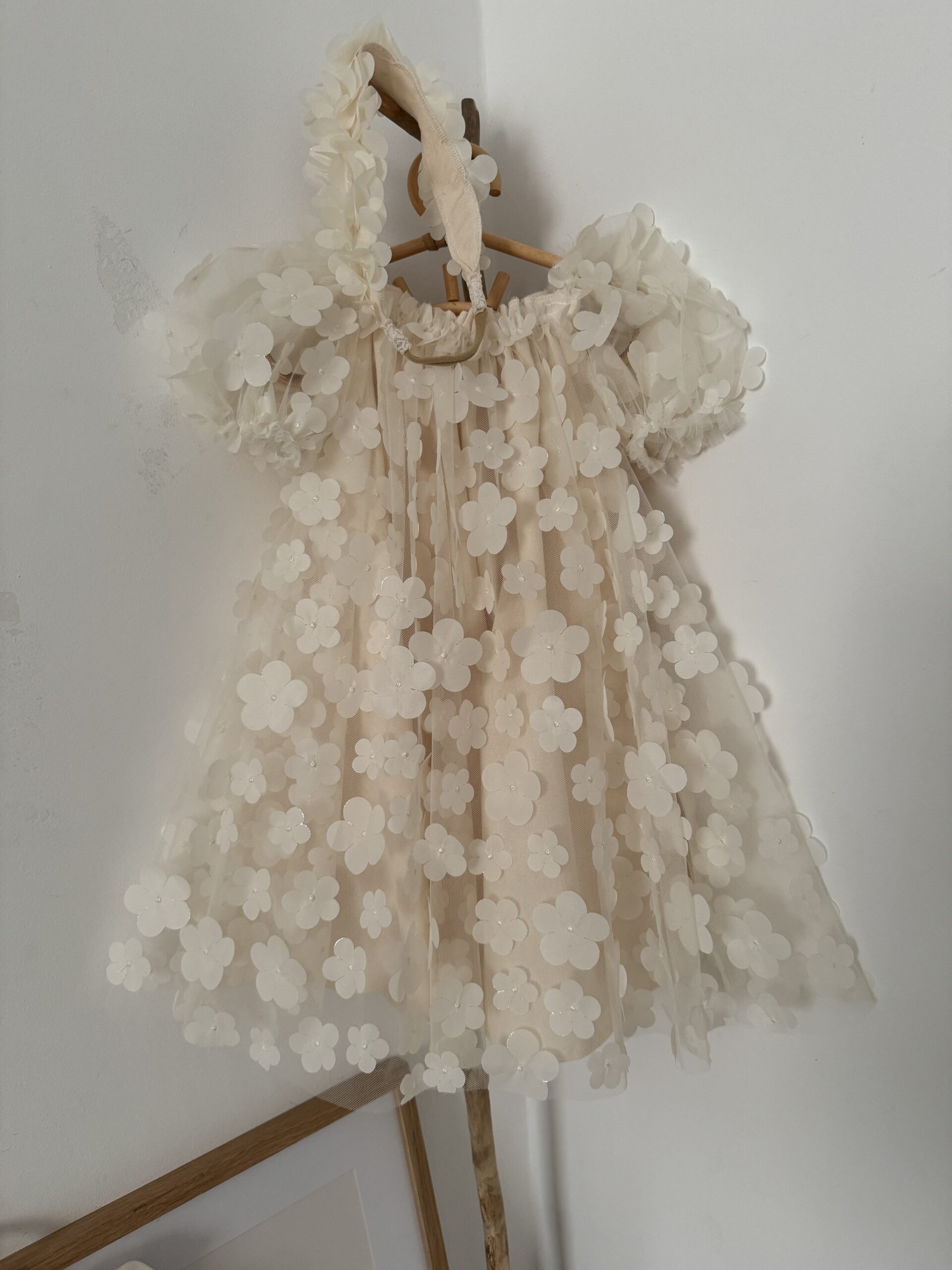 Wyjątkowa, lekka i dziewczęca sukienka dla niemowląt i małych dziewczynek, idealna na chrzest, roczek, wesela i inne uroczystości. Wykonana z efektownego tiulu w kwiatki 3D, który nadaje jej subtelnej elegancji. Skrojona z pełnego koła, co zapewnia piękne układanie się materiału i spektakularny efekt w ruchu. Bufiaste rękawki i bawełniana podszewka gwarantują wygodę i komfort noszenia. Dostępna w kolorach: śmietankowa biel i waniliowy beż. Stylizację można uzupełnić bloomersami, opaską, spineczkami, bonetką lub wiankiem.