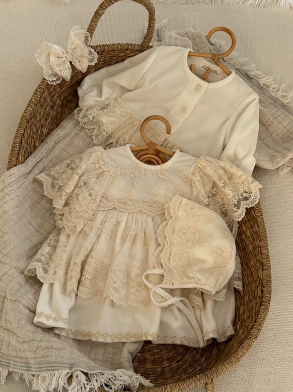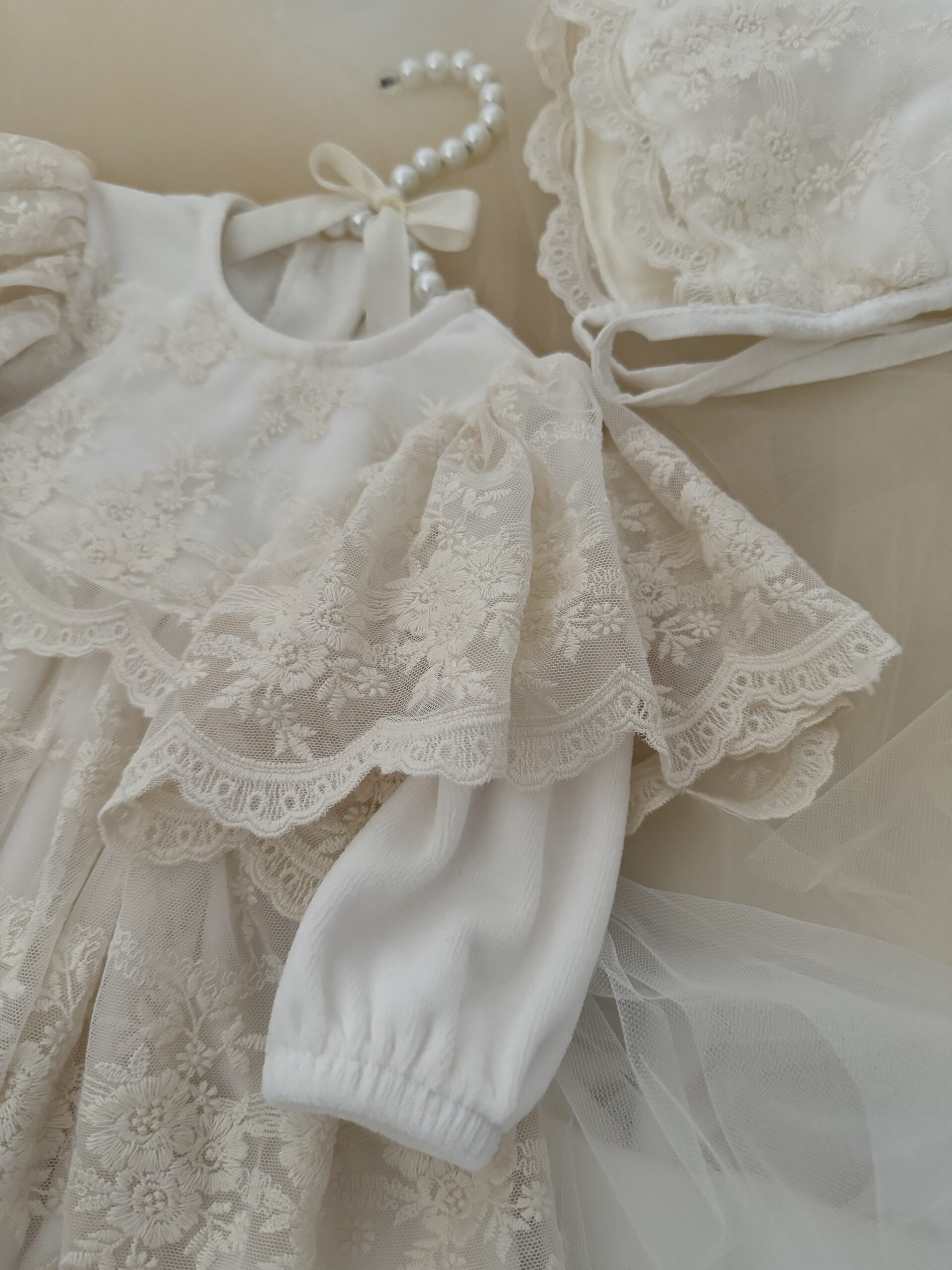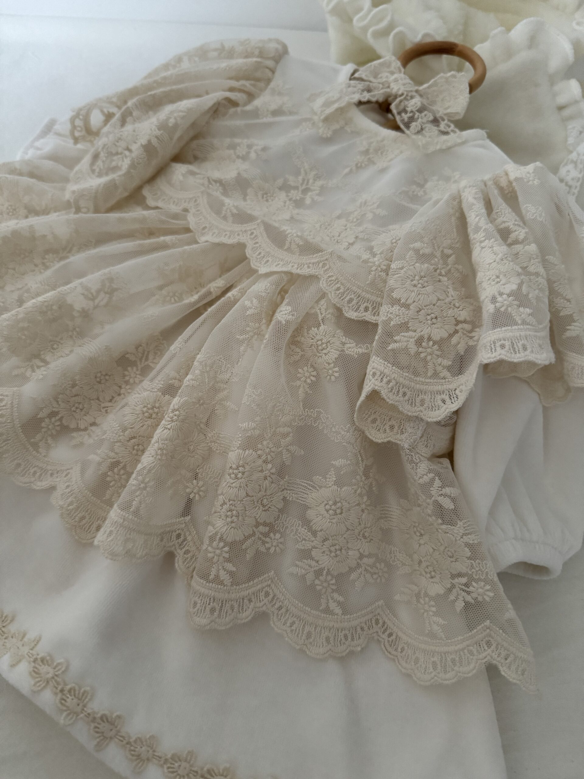 Delikatna i ciepła sukienka dla niemowląt i małych dziewczynek, idealna na chłodniejsze dni. Wykonana z miękkiego weluru bawełnianego i haftowanej siateczki, łączy elegancję z wygodą. Motylkowe rękawki i aplikacja z drobnych kwiatuszków nadają jej subtelnego uroku. Dół sukienki składa się z dwóch warstw: koronkowej i welurowej spódniczki, które pięknie się układają. Guziczki z masy perłowej i głębokie rozcięcie na plecach ułatwiają zakładanie, a dla niemowląt istnieje możliwość wszycia body. Dostępna w trzech kolorach.