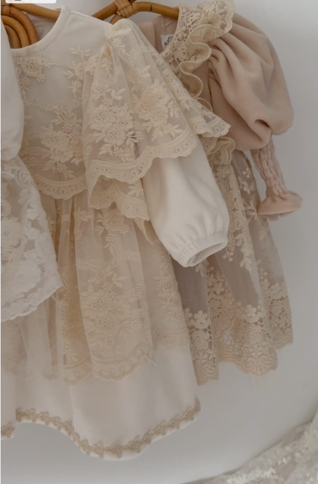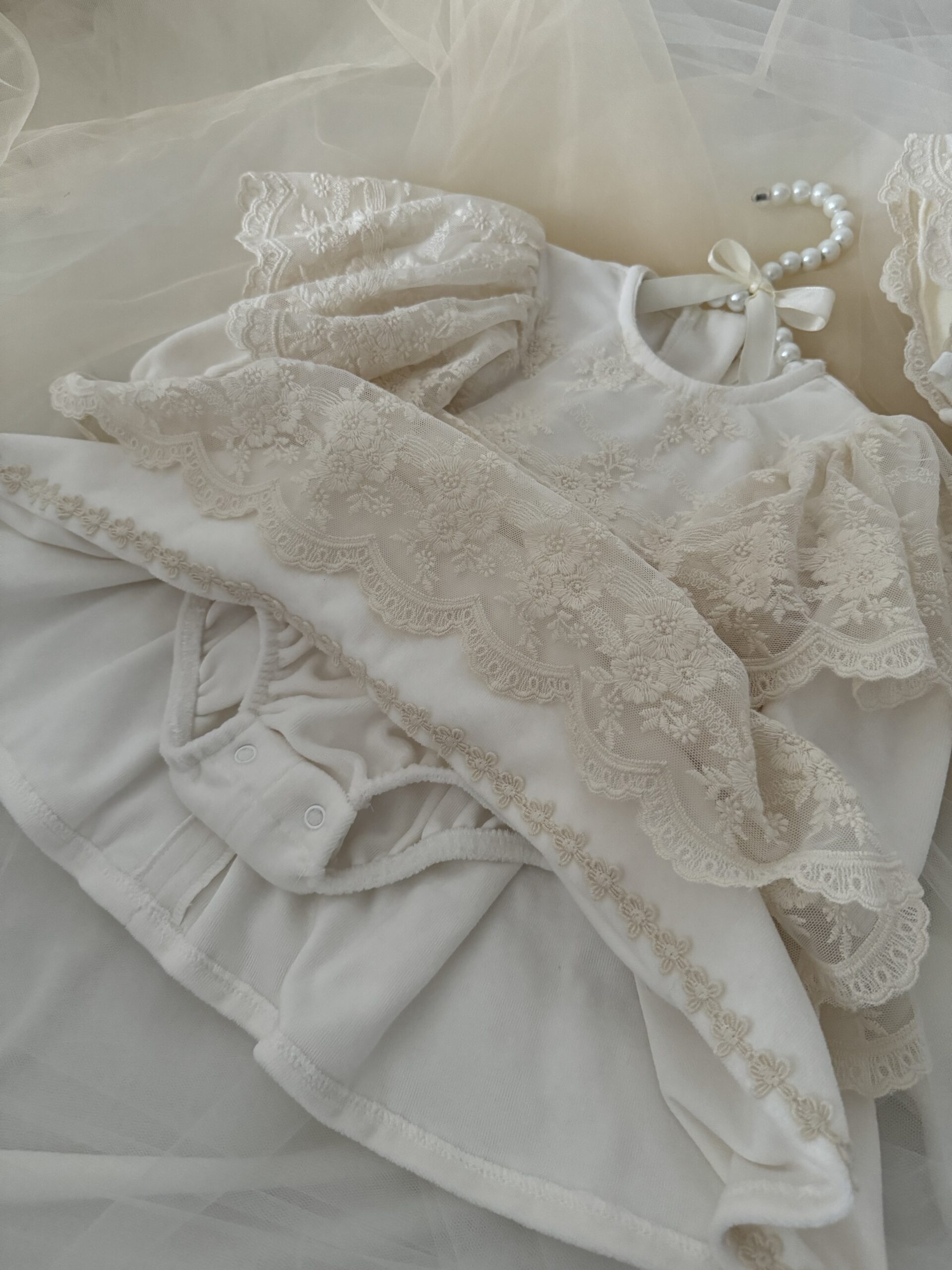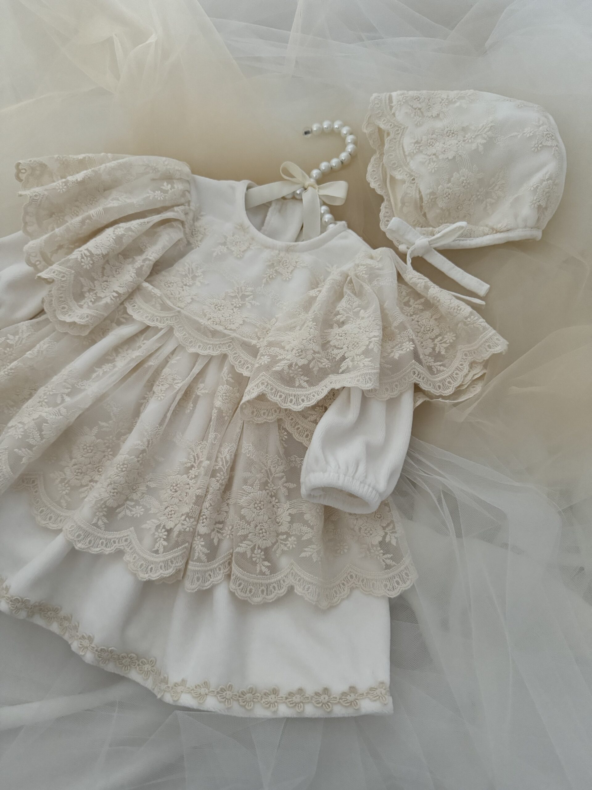 Delikatna i ciepła sukienka dla niemowląt i małych dziewczynek, idealna na chłodniejsze dni. Wykonana z miękkiego weluru bawełnianego i haftowanej siateczki, łączy elegancję z wygodą. Motylkowe rękawki i aplikacja z drobnych kwiatuszków nadają jej subtelnego uroku. Dół sukienki składa się z dwóch warstw: koronkowej i welurowej spódniczki, które pięknie się układają. Guziczki z masy perłowej i głębokie rozcięcie na plecach ułatwiają zakładanie, a dla niemowląt istnieje możliwość wszycia body. Dostępna w trzech kolorach.