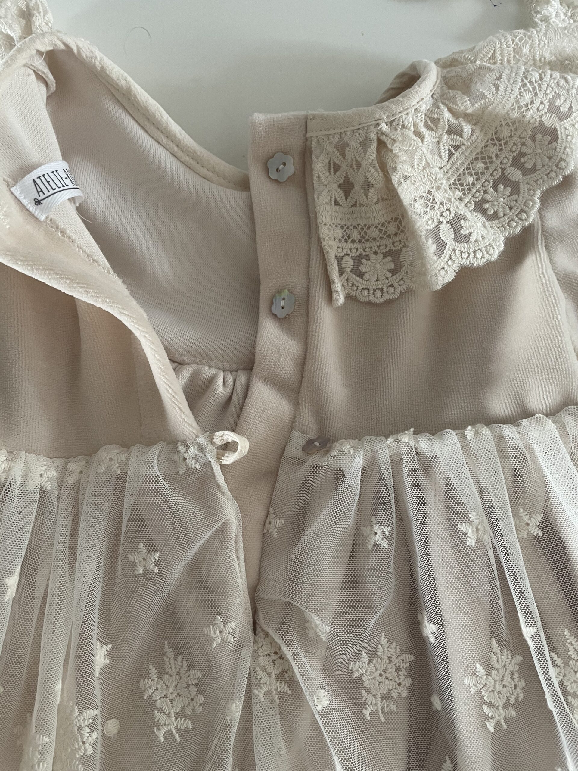 Sukienka Marie z weluru bawełnianego to ciepła, a zarazem niezwykle elegancka propozycja dla niemowląt i małych dziewczynek, idealna na chłodniejsze dni. Wykonana z miękkiej siateczki haftowanej bawełnianą nitką, urzeka subtelnością i dziewczęcym wdziękiem.