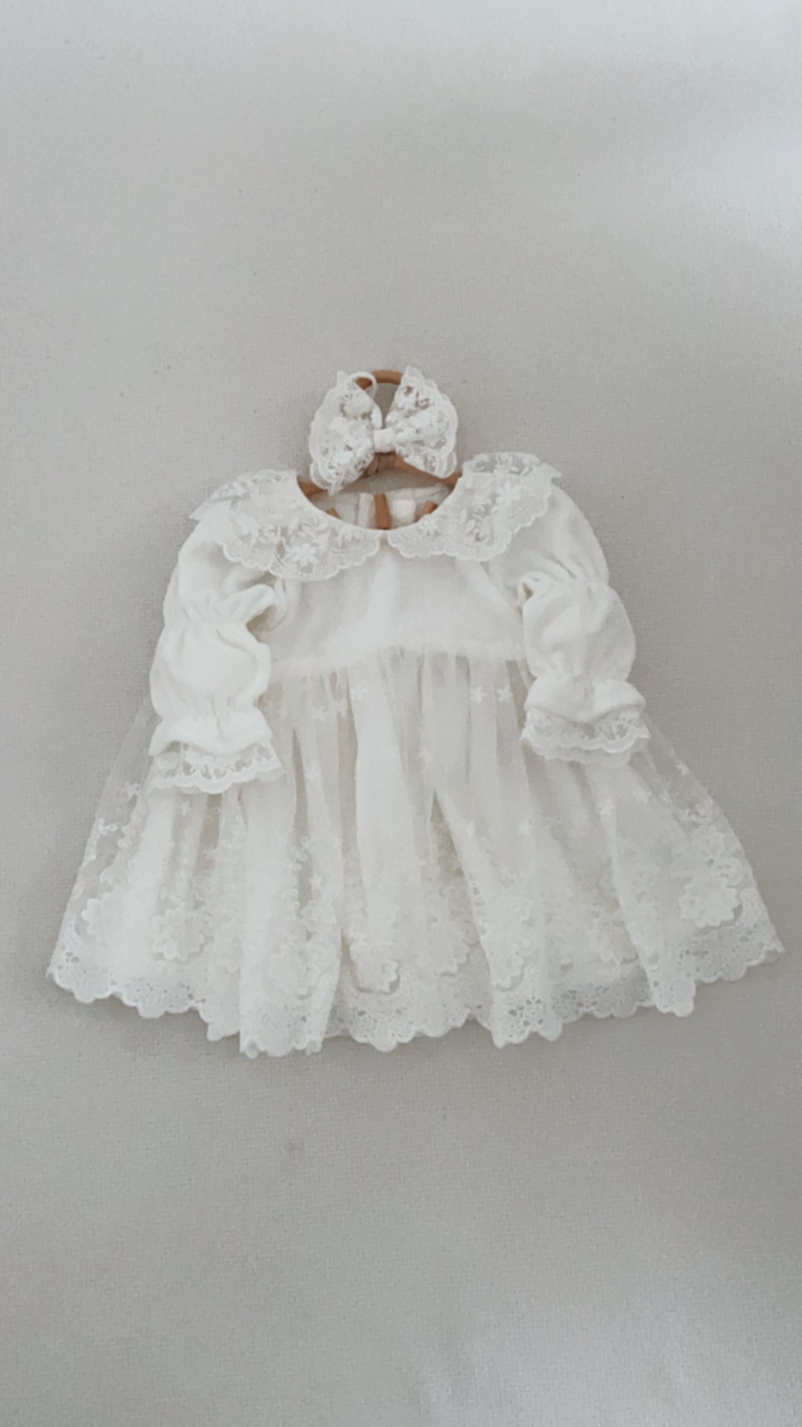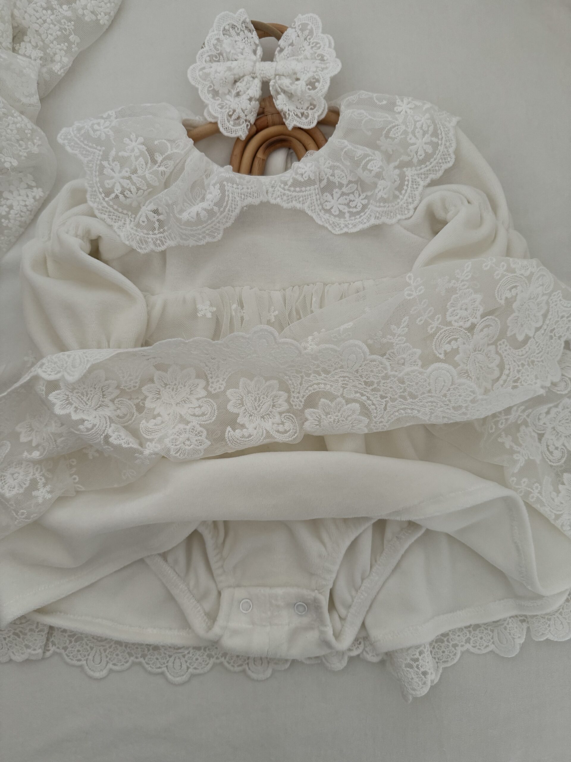 Ciepła i elegancka sukienka dla niemowląt i małych dziewczynek, idealna na chłodniejsze dni. Wykonana z haftowanej siateczki, z podszewką z miękkiego weluru bawełnianego, który zapewnia ciepło i komfort noszenia. Ozdobny, koronkowy kołnierzyk i rękawki zakończone falbanką nadają jej niezwykłego uroku. Głębokie rozcięcie na plecach ułatwia zakładanie, a dla niemowląt istnieje możliwość wszycia body. Dostępna w wersji z długim rękawem, w kolorach: śmietankowa biel i beż.