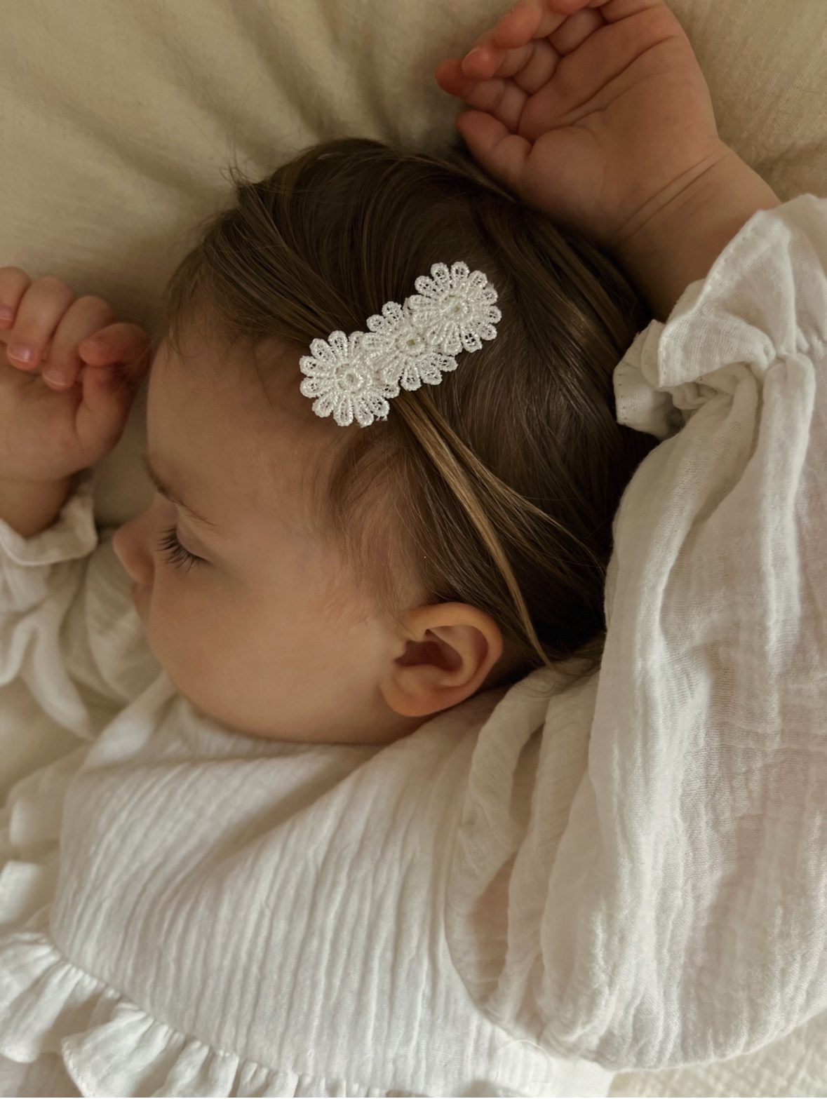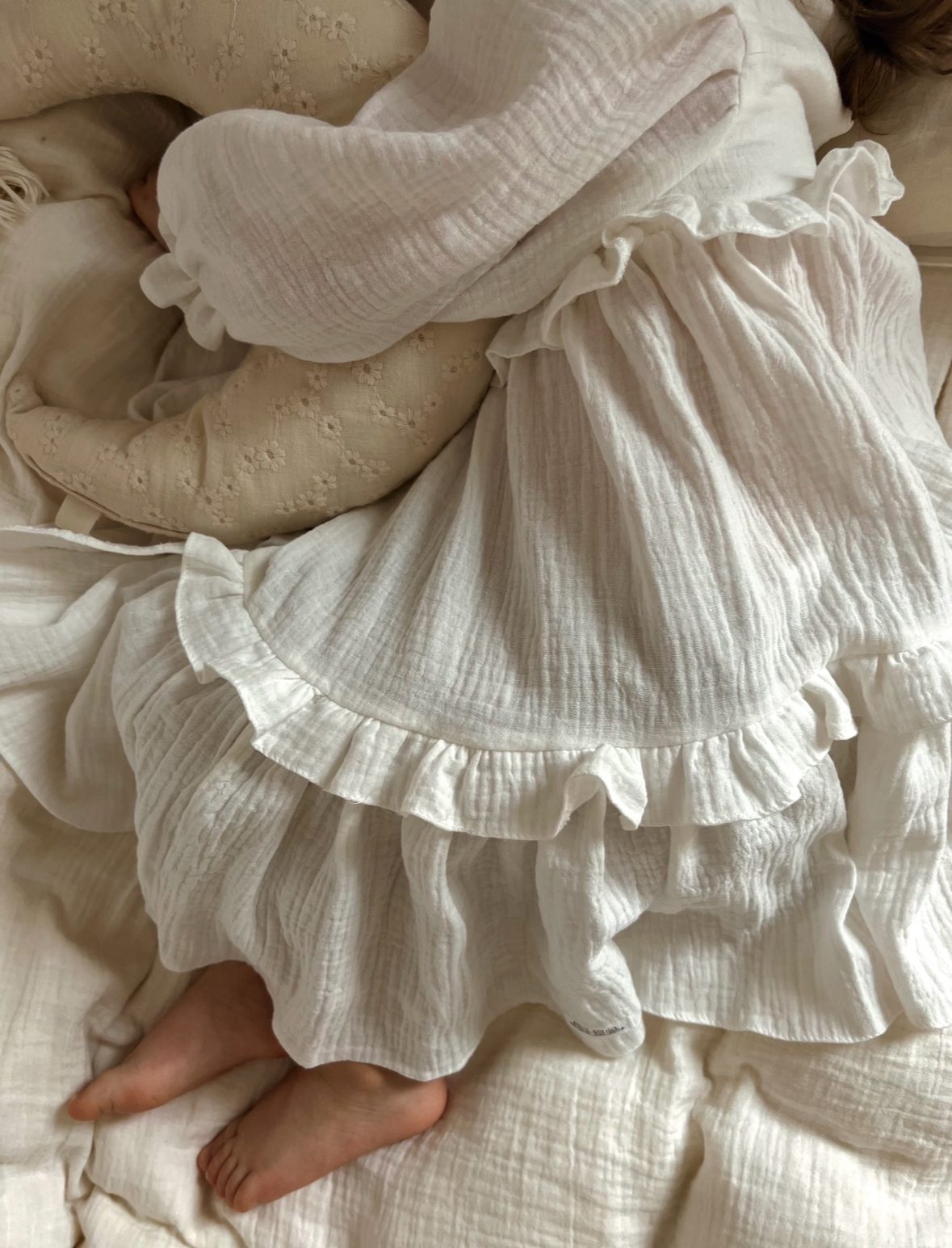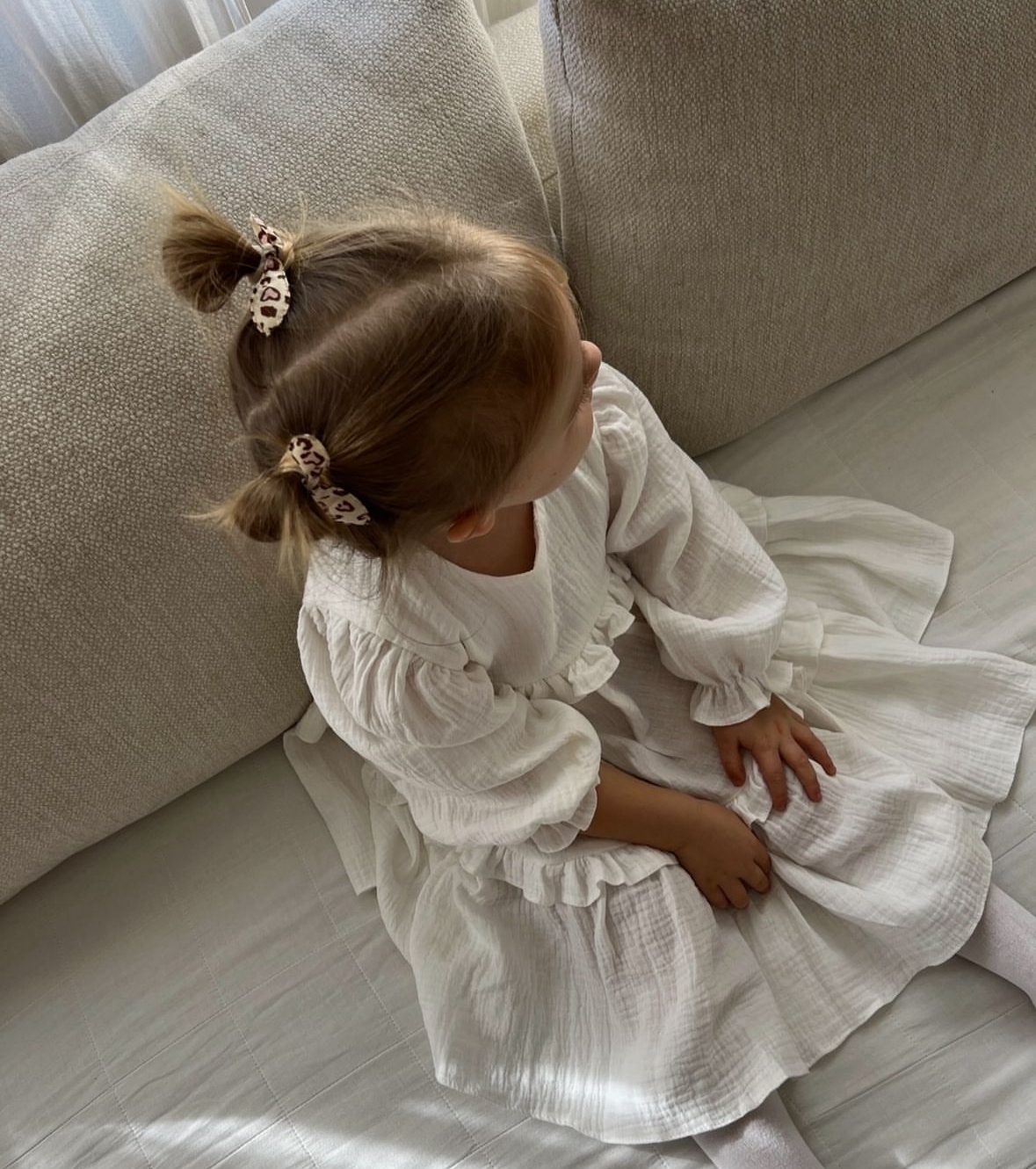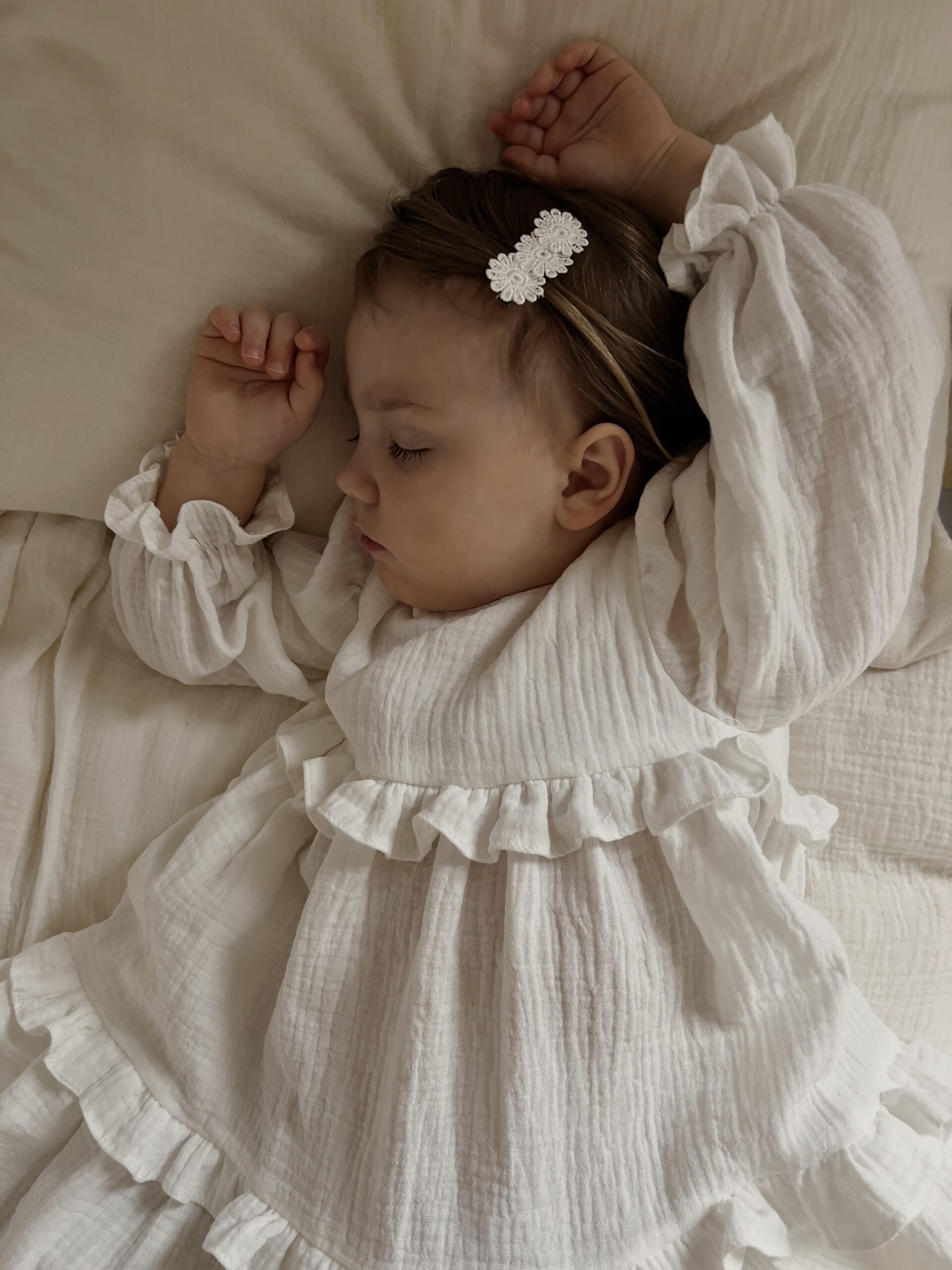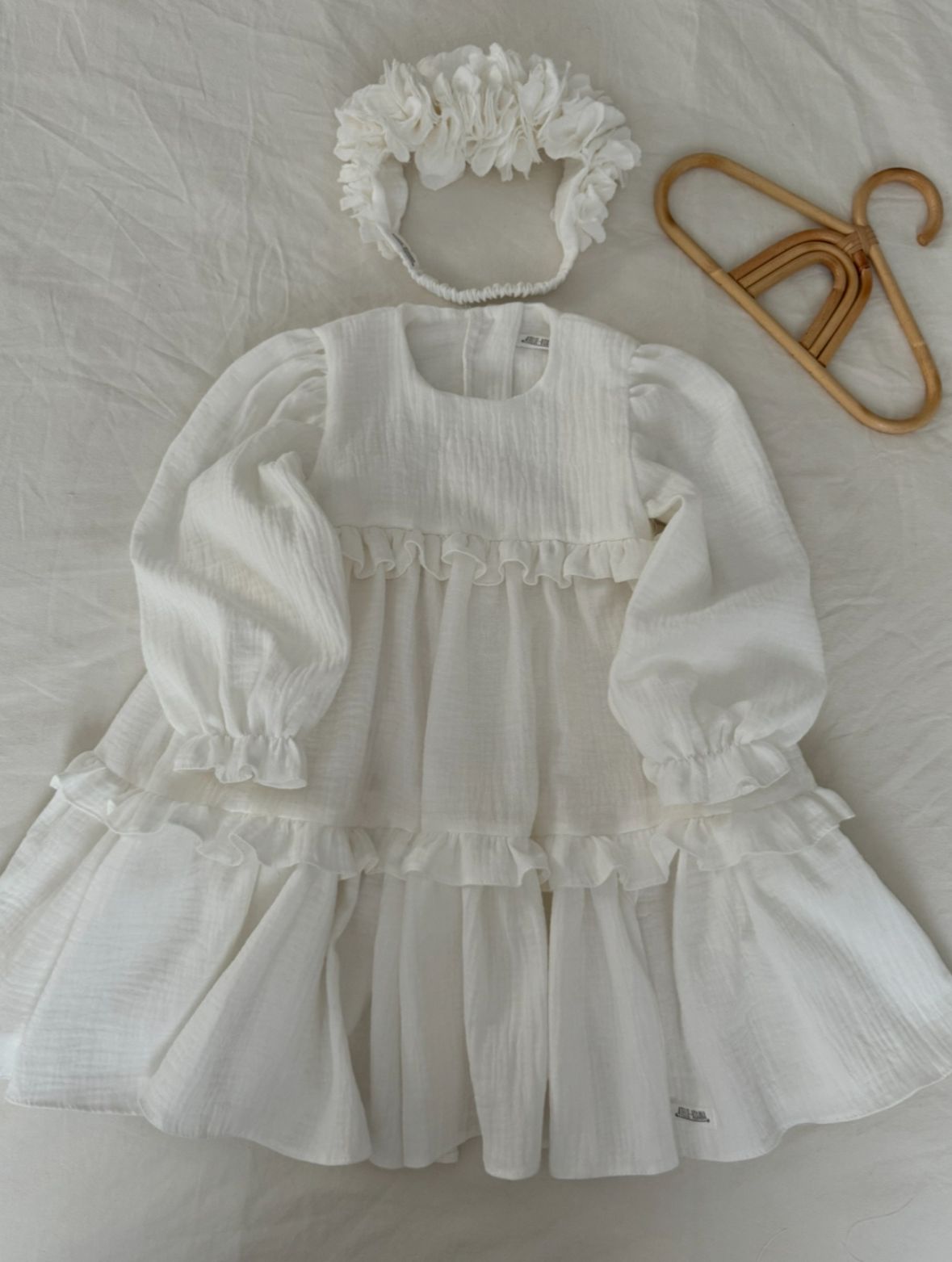 Delikatna i zwiewna sukienka dla niemowląt i małych dziewczynek, idealna na wyjątkowe okazje. Wykonana z naturalnego, oddychającego muślinu bawełnianego, który zapewnia lekkość i komfort noszenia. Bufiasty rękawek oraz dwie delikatne i szerokie falbany sprawiają, że sukienka pięknie się „kręci”, dodając jej uroku. Zapinana z tyłu na guziczki z masy perłowej w kształcie kwiatuszka, z głębokim rozcięciem na plecach dla łatwego zakładania. Możliwość wszycia body w mniejszych rozmiarach. Dostępna w wersji z krótkim i długim rękawem, w kolorach: śmietankowa biel i czysta biel. Stylizację można uzupełnić bloomersami, opaską, spineczkami, bonetką lub wiankiem.