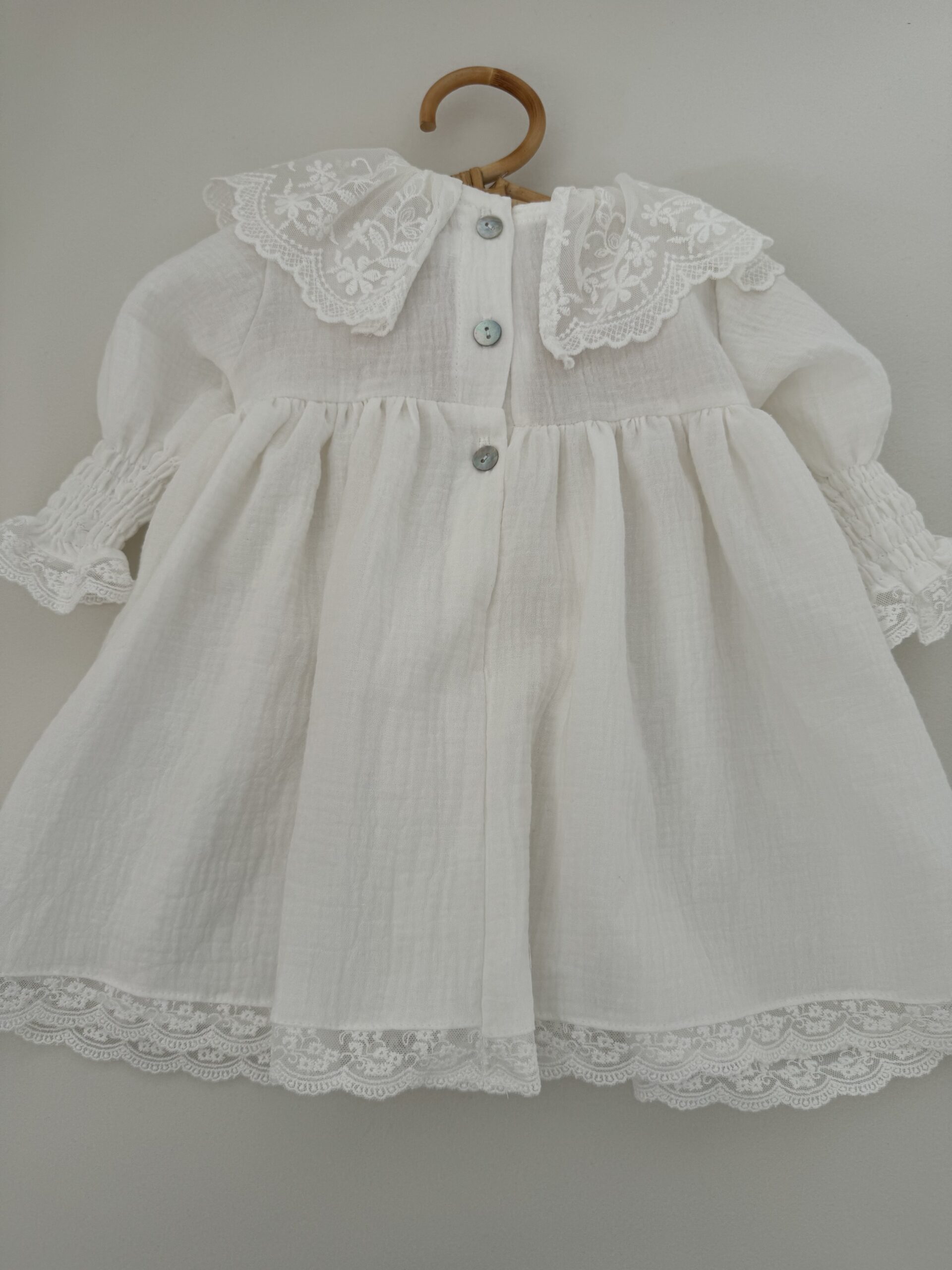 Przewiewna i lekka sukienka dla niemowląt i małych dziewczynek, idealna na cieplejsze dni. Wykonana z naturalnego, oddychającego muślinu bawełnianego, który zapewnia komfort noszenia. Ozdobny, koronkowy kołnierzyk oraz rękawki z gumowanym mankiecikiem i falbanką nadają sukience subtelnego uroku. Dół sukienki wykończony bawełnianą koronką, która pięknie podkreśla lekkość fasonu. Guziczki z masy perłowej w kształcie kwiatuszka oraz głębokie rozcięcie na plecach ułatwiają zakładanie, a dla niemowląt istnieje możliwość wszycia body. Dostępna w wersji z krótkim i długim rękawem, w kolorze: śmietankowa biel.