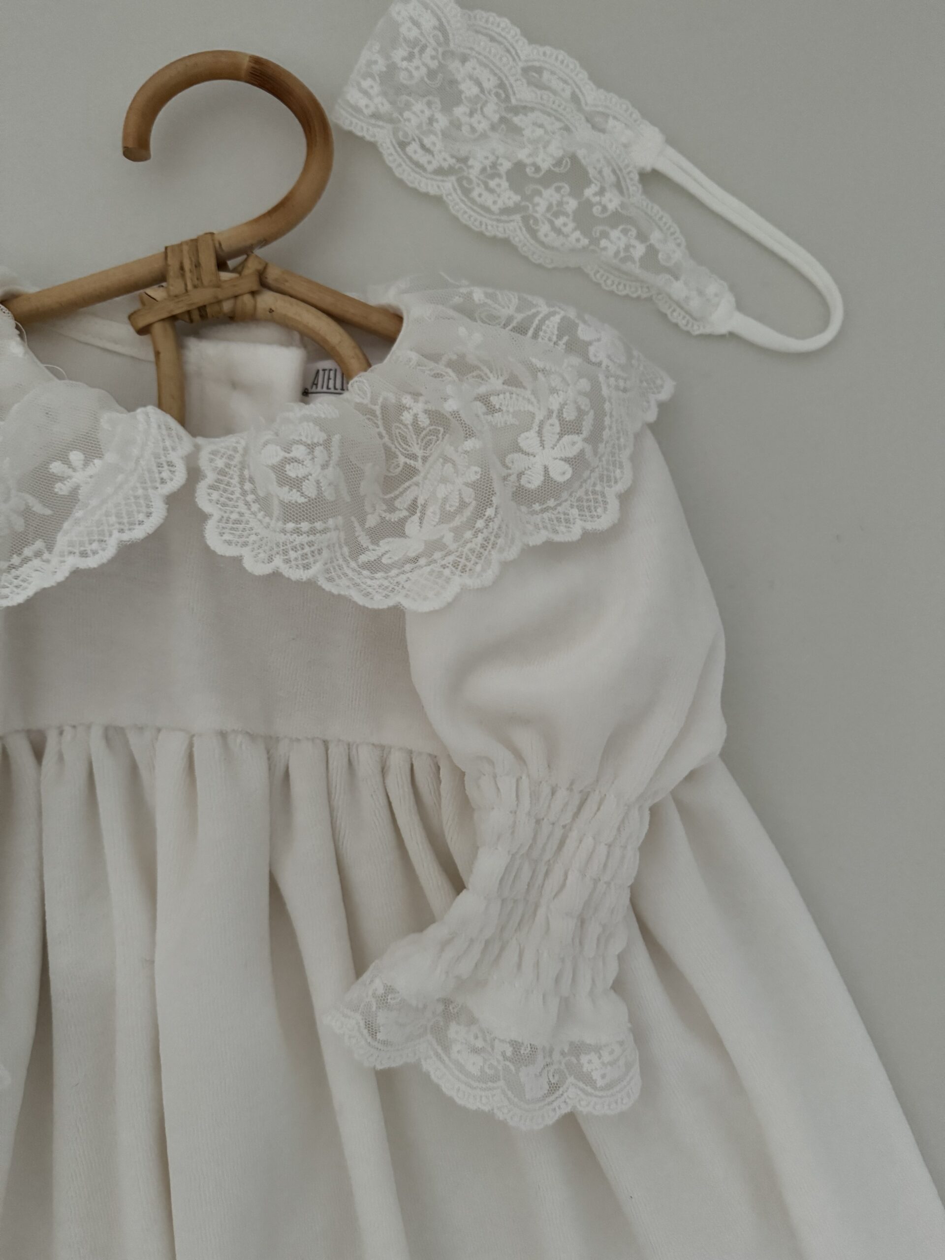 Elegancka i ciepła sukienka dla niemowląt i małych dziewczynek, idealna na chłodniejsze dni. Wykonana z miękkiego weluru bawełnianego, który zapewnia komfort i otulenie. Ozdobny, koronkowy kołnierzyk oraz rękawki z gumowanym mankiecikiem i falbanką nadają jej dziewczęcego uroku. Dół sukienki wykończony bawełnianą koronką, która pięknie się układa. Guziczki z masy perłowej w kształcie kwiatuszka oraz głębokie rozcięcie na plecach ułatwiają zakładanie, a dla niemowląt istnieje możliwość wszycia body. Dostępna w kolorze śmietankowa biel.